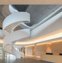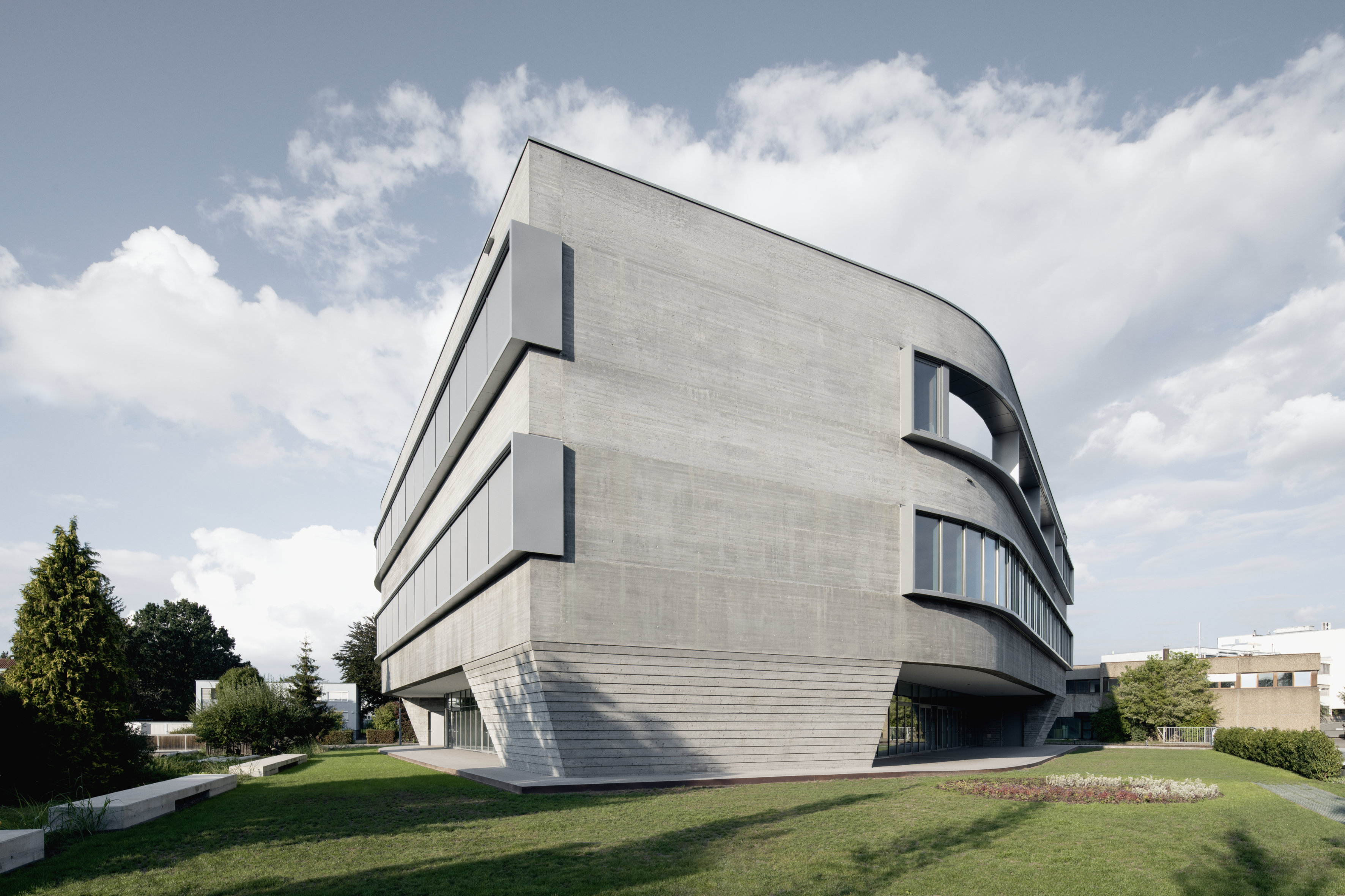 Im Inneren bilden die Sichtbetonflächen die passende Kulisse für das zentrale Atrium, in dem sich eine imposante Stahlwendeltreppe befindet.