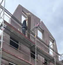 Vor Ort ließ sich die gesamte Gebäudehülle über dem Erdgeschoss innerhalb von nur zwei Monaten errichten, wobei etappenweise jedes Geschoss binnen einer Woche erstellt wurde. Dieses Tempo wurde auch durch die hohe Passgenauigkeit und den hohen Vorfertigungsgrad der Elemente ermöglicht, der zusätzliche Arbeitsschritte vor Ort auf ein Minimum reduzierte. So waren die bis zu zwei mal drei Meter großen Elemente bereits innenseitig fertig gespachtelt und mussten nur noch von außen verputzt werden. Außerdem waren in den Liapor-Wandelementen bereits alle Öffnungen für Türen und Fenster sowie die Rohre und Schlitze für die Haustechnik und die Elektroinstallation enthalten.