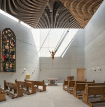 Die neue Kapelle des Gemeindezentrums in Kerpen-Manheim wurde monolithisch aus Liapor-Leichtbeton errichtet. Ausschlaggebend waren die besondere Optik und Materialität des Baustoffs, der die Kirchenobjekte im Inneren in einen ganz neuen Kontext setzt. Außen wurde die Fassade teilweise gestockt, um den Sockelbereich und den Namenszug farblich und strukturell vom Rest des Kirchenbaus abzuheben.