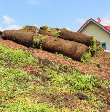 Die Besonderheit bei der Begrünung des innovativen Holzhauses in Unlingen lag in den zwei verschiedenen Dachneigungen von 20 sowie 30 Grad. Dem begegnete ZinCo mit zwei unterschiedlichen Gründachsystemen mit passgenauen Maßnahmen für Schubabtragung und Erosionsschutz. Ein Dachdeckerbetrieb sorgte zunächst für die fachgerechte und wurzelfeste Abdichtung. Dabei wurden auch Grundplatten für Schubhalter eingebaut und abgedichtet, die zusammen mit der bereits vorhandenen Attika den konstruktiven Rahmen für die Begrünung bilden. Auf der flacheren, 65 Quadratmeter großen Dachhälfte kam der Systemaufbau „Begrüntes Schrägdach“ mit Floraset FS 75 zum Einsatz. Dieses Dränelement aus Polystyrol-Hartschaum wurde für den Einsatz auf dem Schrägdach mit der Noppenseite nach oben verlegt. Die Becherstruktur ist in der Lage, das Substrat auf Schrägdächern bis 25 Grad Dachneigung zuverlässig zu verzahnen. Darunter unterstützt eine Bewässerungs- und Schutzmatte (BSM 64) die aufgebrachte Systemerde beim Speichern des Regenwassers. Die verwendete Erde wurde mittels eines Kran-Lkw in Big Bags auf das Dach transportiert und dort per Schaufel und Rechen gleichmäßig auf der Dachfläche verteilt. „Die aufgebrachte Substrathöhe beträgt im Mittel rund elf Zentimeter und bietet den eingesetzten Vegetationsmatten über Jahrzehnte eine ideale, ihren Ansprüchen angepasste Wachstumsgrundlage“, erklärt Sophie Lößner. Die mit vier bis acht unterschiedlichen Sedum-Arten bewachsenen, vorkultivierten Vegetationsmatten „Sedumteppich“ wurden auf dem Substrat ausgerollt und befestigt und hielten wie geplant alles an Ort und Stelle.