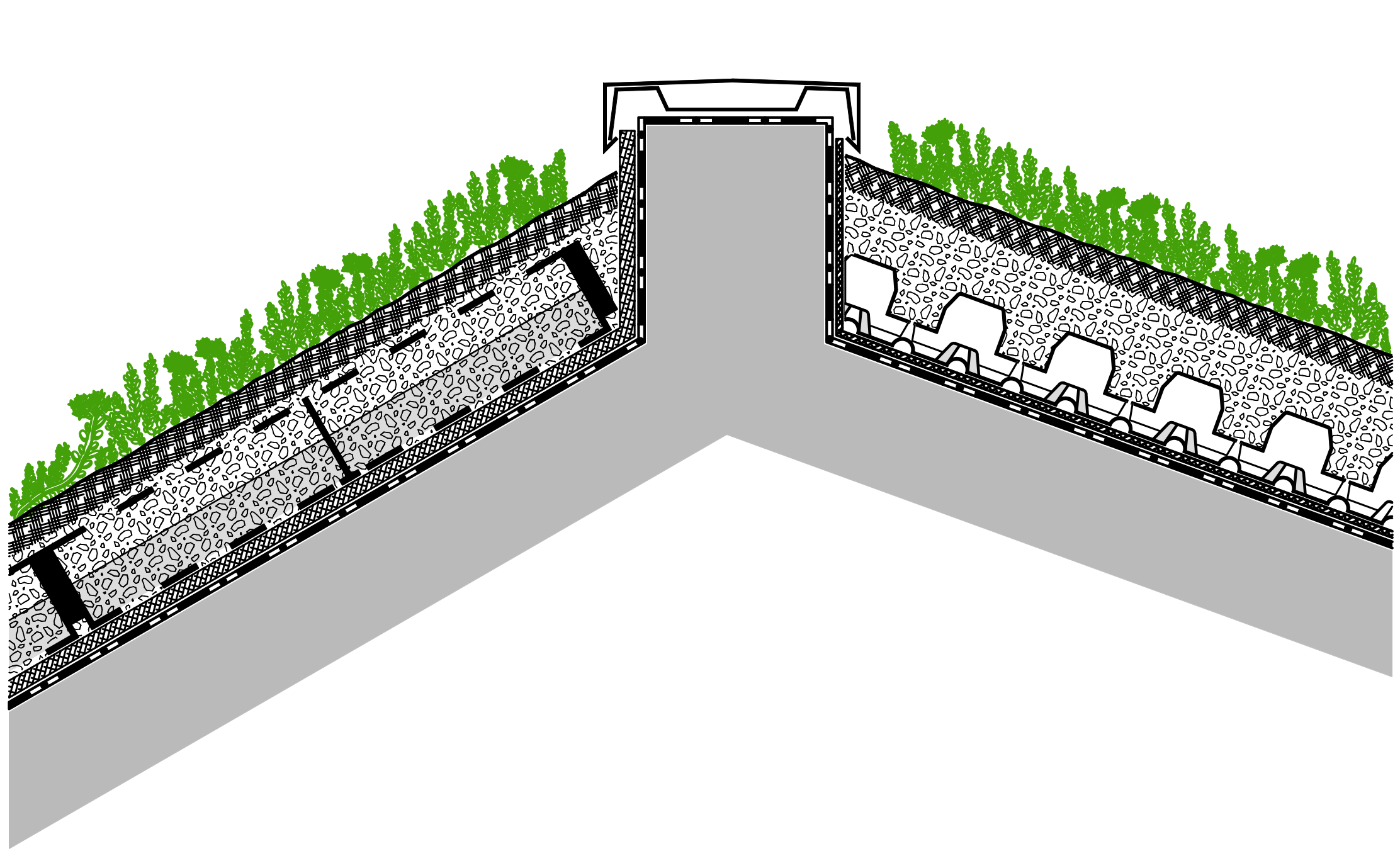 Entsprechend der Dachneigungen kamen die ZinCo-Systemaufbauten „Begrüntes Schrägdach“ mit Floraset FS 75 (rechts im Bild) und „Begrüntes Steildach“ mit Georaster (links) zum Einsatz.