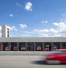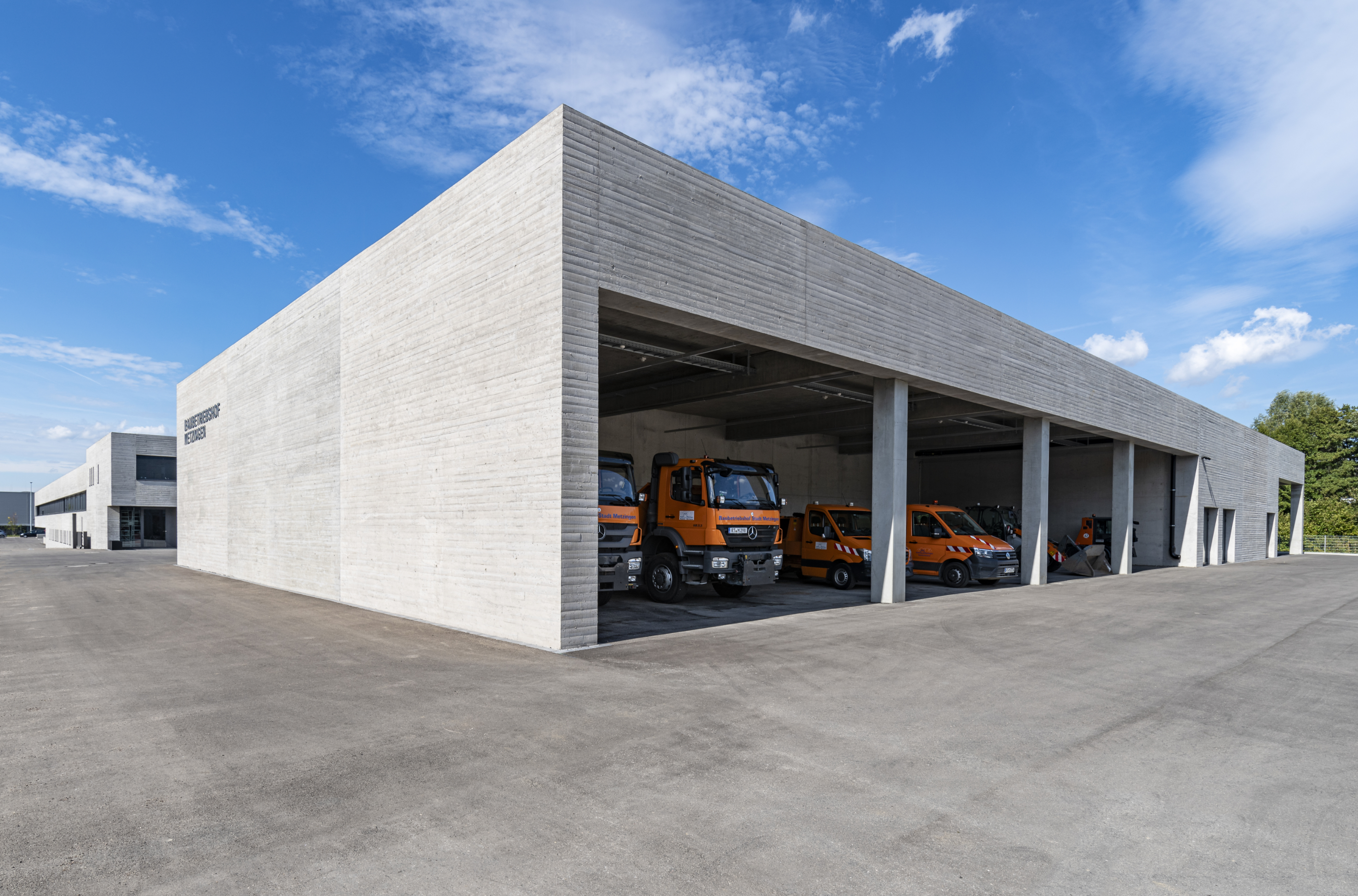 Vor Kurzem bezogen in Metzingen die Feuerwehr und der städtische Bauhof ihr neues, im Süden der Stadt gelegenes Quartier. Es besteht aus zwei Gebäudeeinheiten mit einer Bruttogeschossfläche von gut 7.000 Quadratmetern, die leicht terrassiert der Geländetopographie folgen und über eine Rampe miteinander verbunden sind. Im nordwestlichen, u-förmigen Gebäudekomplex ist die Feuerwehr untergebracht, und hier befinden sich auch die Fahrzeughalle für 26 Einsatzwagen samt Schlauch- und Übungsturm, Werkstätten, Waschhalle, sowie Büros und Schulungsräume. Daran schließt sich in südöstlicher Richtung der Gebäuderiegel des Baubetriebshofs an, zu dem unter anderem eine Halle für zwölf Fahrzeuge sowie eine Schreiner- und Schlosserwerkstatt gehören. Die beiden Bereiche für die Feuerwehr und den Bauhof sind dabei räumlich klar voneinander getrennt, sodass sich die Einheiten nicht in die Quere kommen und ein reibungsloser Betrieb sichergestellt ist. Konzipiert und umgesetzt wurde das Projekt unter der Bauherrschaft der Stadt Metzingen vom Architekturbüro dasch zürn + partner in Stuttgart, das den entsprechenden Wettbewerb 2017 gewann.