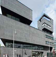 Eines der Highlights des neuen Gebäudes ist seine schwarze Fassade in fugenloser Sichtbeton-Optik. Gleichzeitig galt es aufgrund der anspruchsvollen Architektur mit Auskragungen von über zwölf Metern, einen besonders leichten und tragfähigen Beton zu finden, der zudem die Anforderungen an eine möglichst dunkle und gleichmäßige Oberfläche ohne Kalkausblühungen, Lunkerbildungen oder glänzende Stellen optimal erfüllt. "Aus bauphysikalischen und statischen Gründen wurde eine zweischalige Außenwandkonstruktion mit Kerndämmung gewählt, wobei aus Gewichtsgründen die äußere Schale nur durch einen Leichtbeton realisiert werden konnte", erklärt der zuständige Bauleiter und Architekt Jacob van Ommen. "Für die Wahl des richtigen Leichtbetons mussten die Anforderungen an Festigkeit, Gewicht und Herstellbarkeit berücksichtigt und daraus das optimale Verhältnis zwischen Betongüte und Vorsatzschalendicke ermittelt werden."