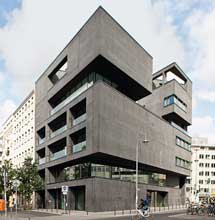 Mit dem neuen Wohn- und Geschäftshaus am Berliner Rosa-Luxemburg-Platz konzipierte Architekt Roger Bundschuh zusammen mit der Künstlerin Cosima von Bonin einen skulpturalen, wie aus einem Block geschnittenen Bau. Für die besondere Ausstrahlung des Objekts sorgt auch die Fassade in schwarzer Sichtbeton-Optik aus Liapor-Leichtbeton, dessen besondere bau-physikalischen Eigenschaften auch erst die Umsetzung der komplexen Gebäudegeometrie ermöglichten.
