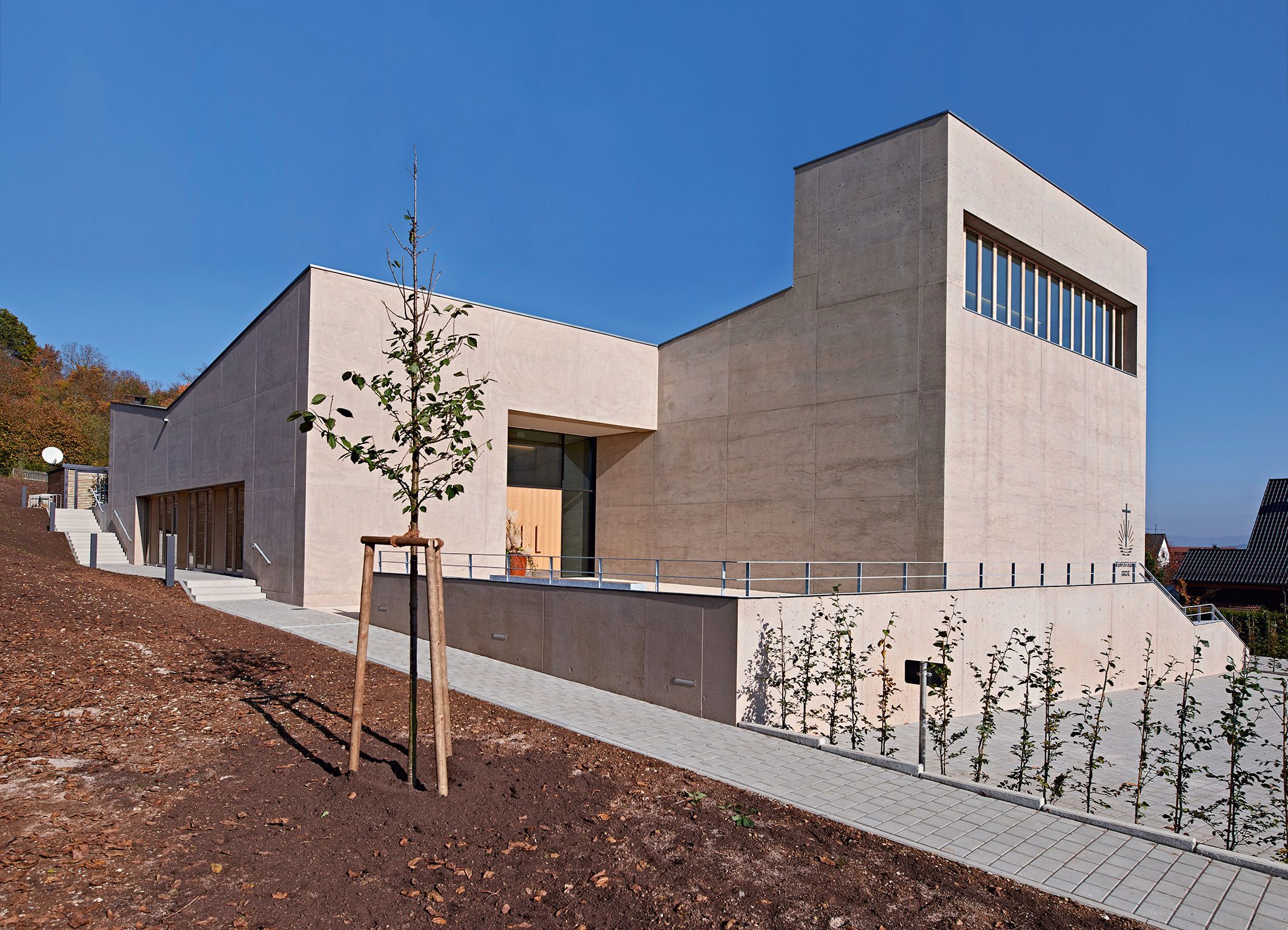 Die in heller Sichtbetonoptik erstellte Gebäudehülle aus Liapor-Leichtbeton passt perfekt zum skulpturalen Charakter des Kirchenneubaus.