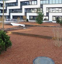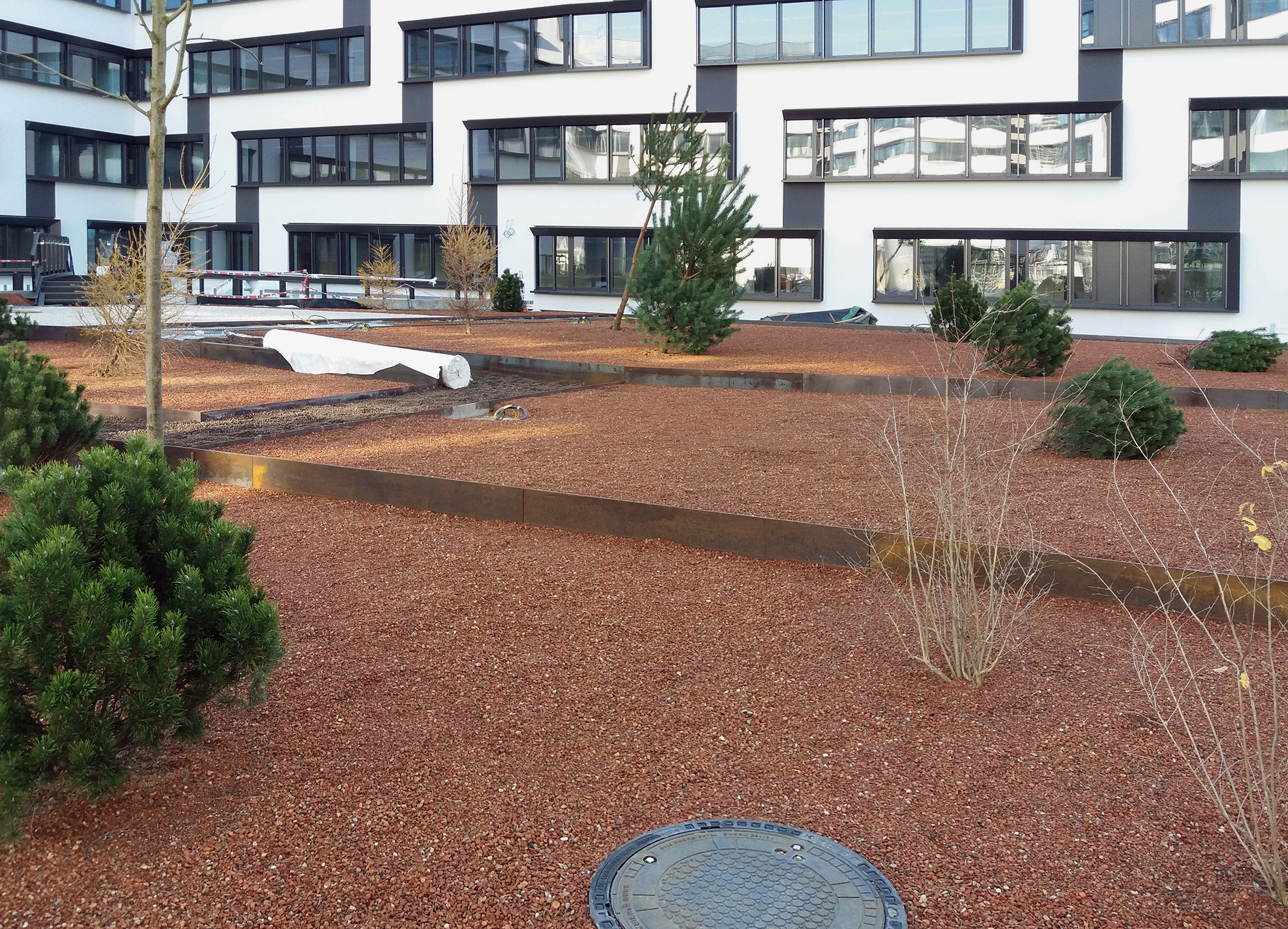 Bei der Wahl der Vegetationsbasis für das Grün der Innenhöfe entschied man sich für Liapor Ground, das Blähton-Granulat mit 1-16 mm großen, rund und gebrochen gemischten Blähtonkugeln. „Zum Einsatz kamen hier knapp 7.000 Kubikmeter Liapor Ground, das in Schichtdicken zwischen vier Zentimetern und zwei Metern die ideale Basis für die intensive Bepflanzung der Innenhöfe darstellt“, erklärt Helmut Reitmeyer von der Lias Österreich GesmbH. „Es ist ein gemäß Ö-Norm zertifiziertes, leichtes, trag- und drainagefähiges Untersubstrat, das keine weiteren Vegetationsschichten oder Erdaufbauten benötigt.“ Das Blähton-Granulat erfüllte aber noch viele weitere wesentliche Vergabekriterien. So musste das Substrat aufgrund der eingeschränkten Tragfähigkeit der Garagendächer unter den Innenhöfen besonders leicht sein, was Liapor Ground mit einer Trockenschüttdichte von lediglich 500 kg/m³ bestens erfüllte.