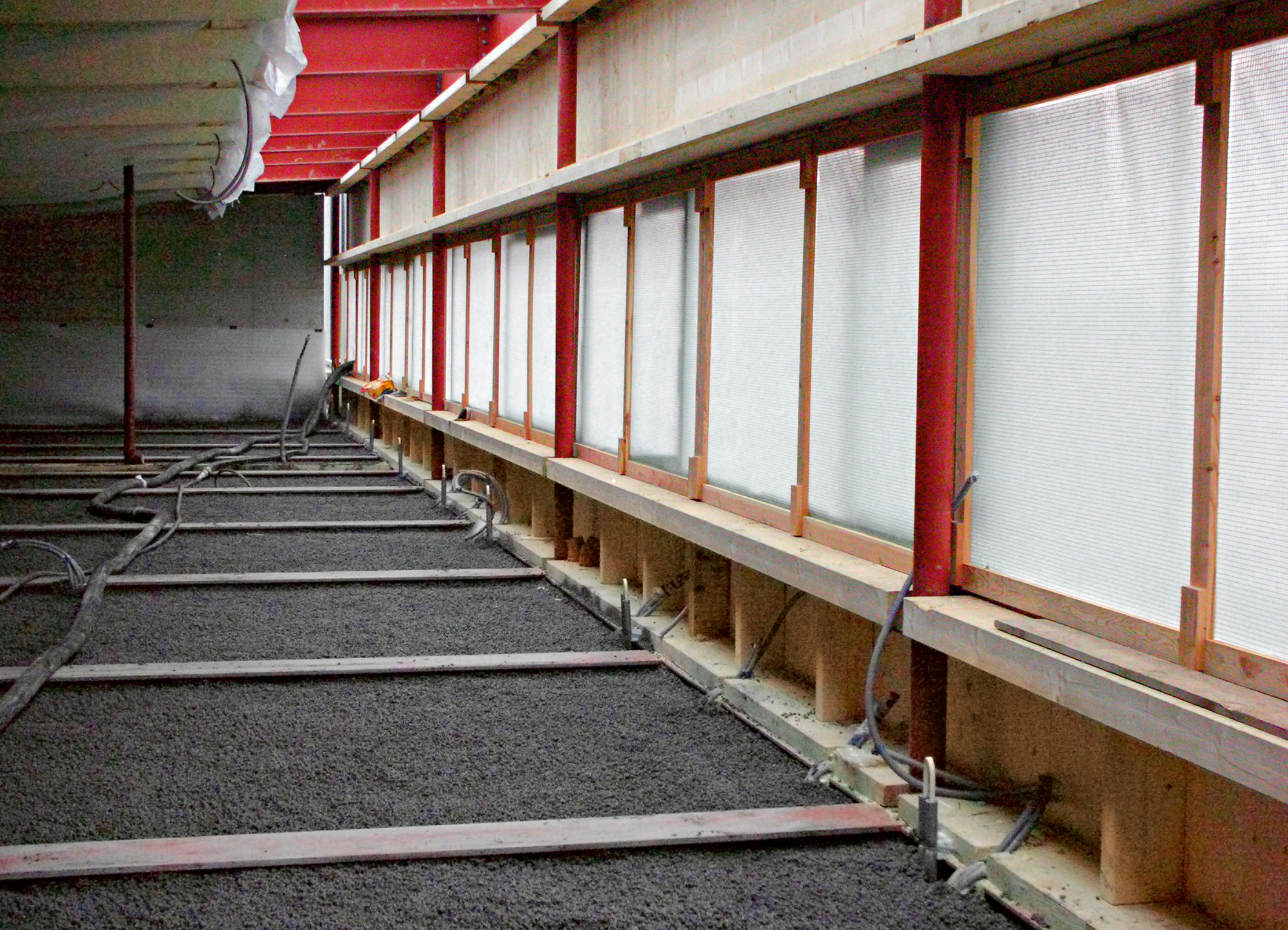 Der zweigeschossige Baukörper der Schule ist als Skelettbau in Holz-Stahl-Verbundbauweise umgesetzt. Das Haupttragwerk besteht aus einer Stahlkonstruktion, deren Querträger im Abstand von drei Metern montiert sind. Die entsprechenden Zwischendecken bestehen an ihrer Basis aus statisch tragenden, mehrschichtig verleimten Holzplatten, die gleichzeitig als Sicht- und Deckenflächen in den beiden oberen Geschossen für eine ansprechende Optik sorgen. Während dieser Teil der Zwischenböden relativ einfach zu realisieren war, erforderte die anschließende Verfüllung der Geschossdecken bis zur Oberkante der Stahlträger ein besonders leistungsstarkes Material. "Es musste eine verschleißfreie, schnell begehbare Oberfläche geschaffen werden", erklärt Reinhard Goldberger, Prokurist der Weisshaidinger Ingenieur-Holzbau GmbH. "Gleichzeitig sollte das Schüttgut vorhandene Höhentoleranzen ausgleichen, effektiven Schallschutz bieten und auch bauökologisch ins Konzept der Schulanlage passen." Die Lösung bot eine zementgebundene Liapor-Schüttung, die als leichtes, stabiles, wärme- und schalldämmendes Material nicht nur die bauphysikalischen, sondern auch die ökologischen und baubiologischen Ansprüche optimal erfüllte.