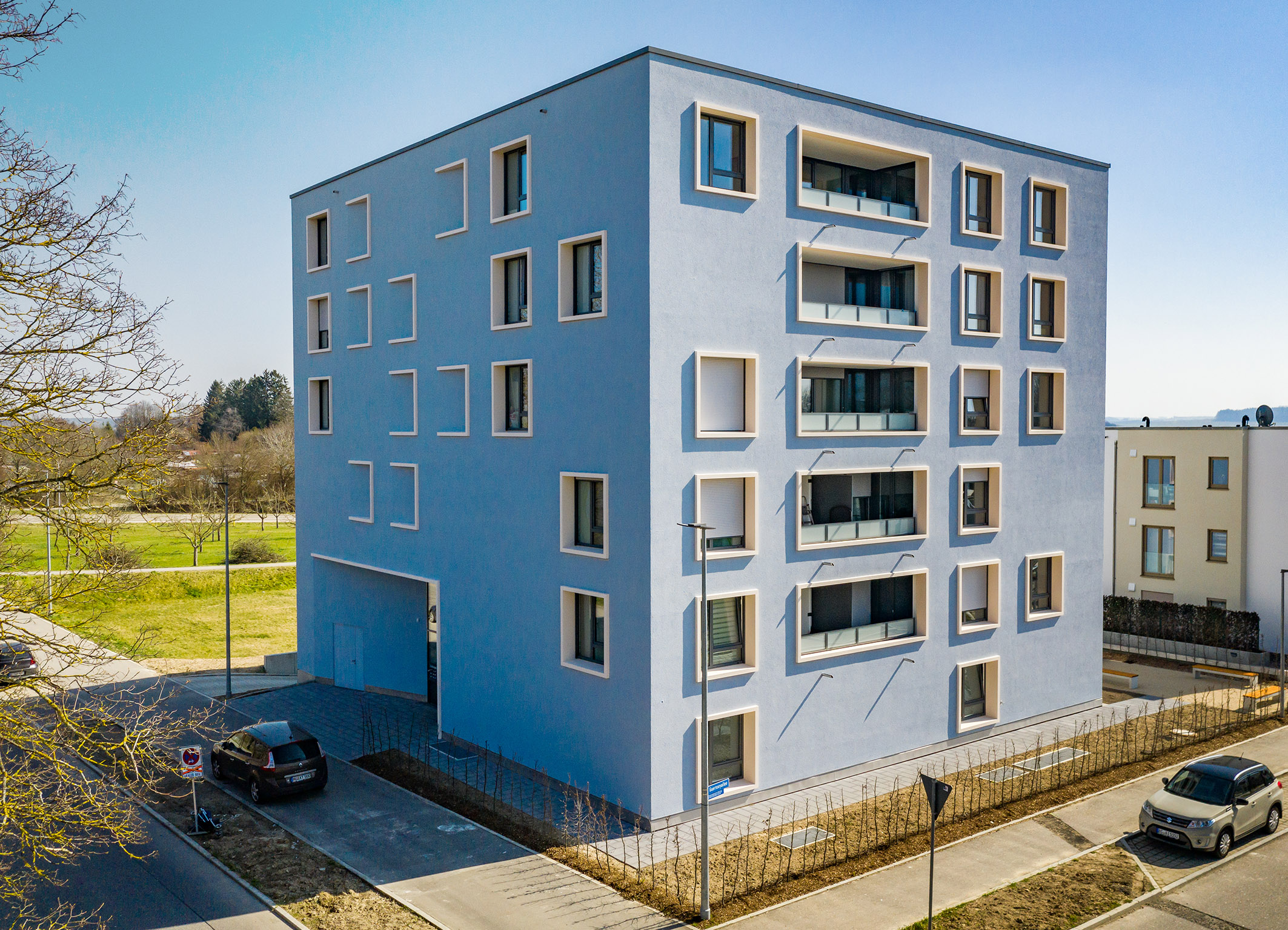 In der Hochvogelstraße 56 in Biberach steht seit Kurzem ein markantes, sechsstöckiges Wohnhaus, das auf einer Gesamtfläche von rund 1.500 Quadratmetern Platz für insgesamt 18 familienfreundliche Wohnungen bietet. Der hoch aufragende, in hellem Blau gestaltete Kubus ist bewusster Teil der umgebenden Neubebauung und dient als Entree zum gesamten Ensemble. Errichtet wurde er unter der Bauherrschaft der Baugenossenschaft Biberach eG, als Architekt fungierte die ZG Architekten GmbH in Ulm. Das Büro hatte den vorangegangenen Wettbewerb gewonnen und das unabhängige Preisgericht mit Vertretern der Bauherrschaft, der Stadt Biberach und des örtlichen Gestaltungsbeirats überzeugt: „Entscheidend war, dass das Gebäude von den Nutzungsbedingungen wie Wohnfläche, Wohnungs- und Geschossanzahl her gepasst hat, für uns als Bauherr aber auch im wirtschaftlich verfügbaren Rahmen lag“, berichtet Patrick Detzel, geschäftsführender Vorstand der Baugenossenschaft Biberach eG. Zudem passte das Gebäude wie gewünscht gut zum städtebaulichen Kontext, und nicht zuletzt gefiel auch die Idee der Fenster mit farblich abgesetzter Haptik, die die Fassade akzentuieren.
