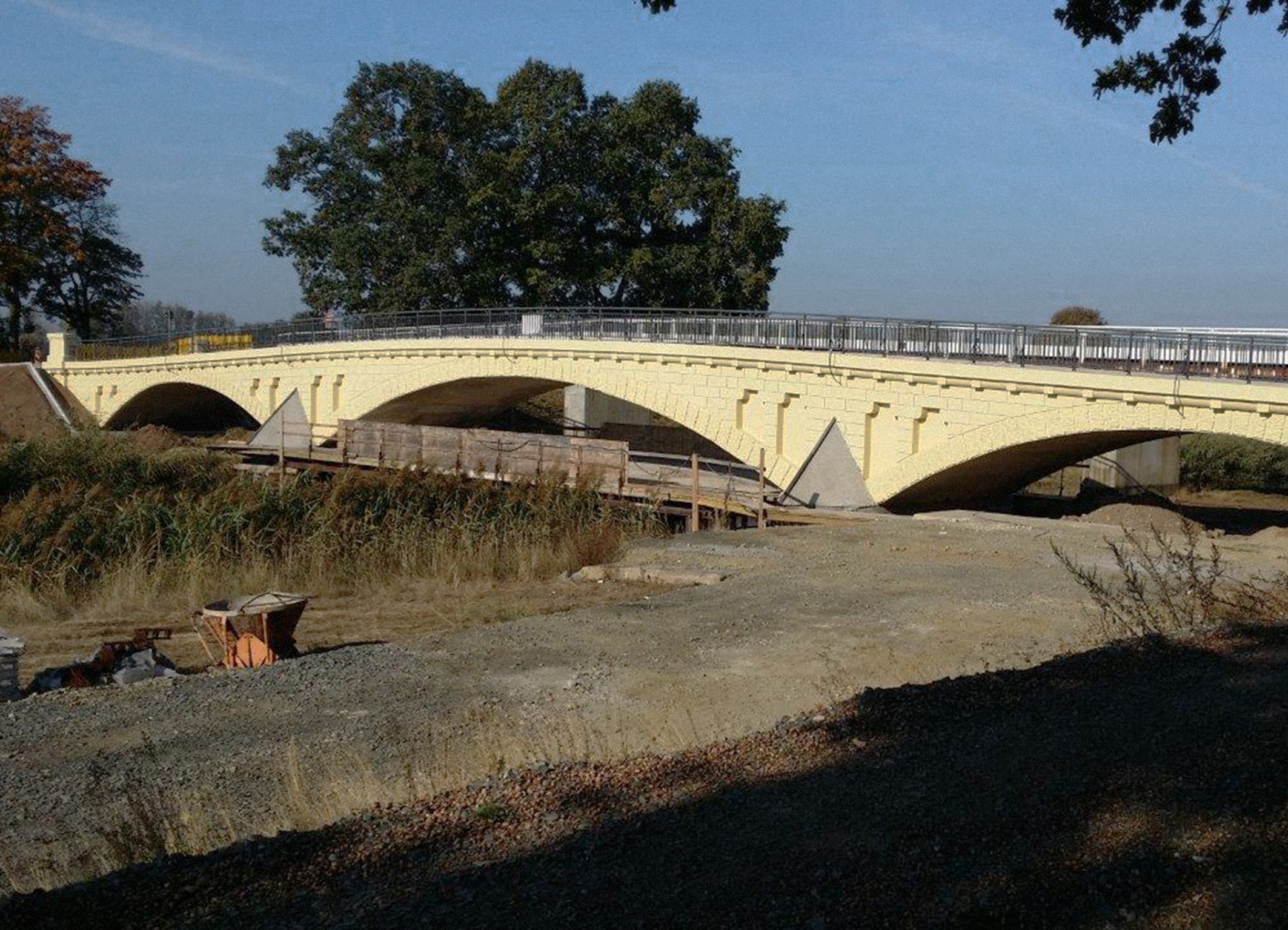In der Annahme, die Betonbogenbrücke sei akut einsturzgefährdet, wurde das Viadukt Mitte der 1990er-Jahre für den Verkehr gesperrt. Direkt daneben entstand eine Behelfsbrücke. Ein kürzlich erstelltes Gutachten machte jedoch klar: Stabilität und Tragfähigkeit des Bauwerks sind auch nach weit mehr als hundert Jahren vollkommen intakt und mit einer gewissen Ertüchtigung auch für den heutigen Bedarf ausreichend. Daraufhin begann 2016 unter der Bauherrschaft des Landkreises Elbe Elster die denkmalgerechte Sanierung des Viadukts. Zunächst wurde die Fahrbahndecke rückgebaut. Darunter zeigte sich die Füllung der Bögen, die aus Bauschutt bestand und ebenfalls entfernt wurde. Im Zuge der Sanierungsmaßnahmen wurden anschließend die Bögen zur Erhöhung der Dichtigkeit zusätzlich verpresst. Im Anschluss wurden die seitlichen Wangen samt Querstegen aus Normbeton neu erstellt. Diese bilden das Grundgerüst der Brücke und sichern deren Tragfähigkeit. Damit waren die grundlegenden Sanierungs- und Ertüchtigungsmaßnahmen abgeschlossen.