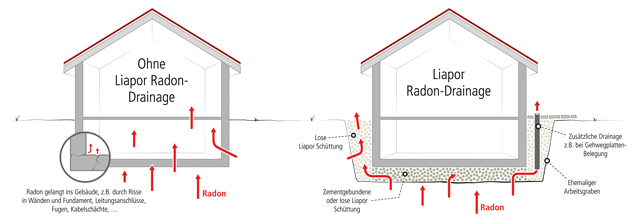 Radioaktives Radongas kann aus dem Boden ins Gebäude eindringen und Gesundheitsschäden verursachen (l.). Dagegen lässt sich mit der Liapor Radon-Drainage (r.) bei Neubauten die Radonbelastung auf ein gesundheitlich unbedenkliches Maß reduzieren.