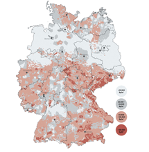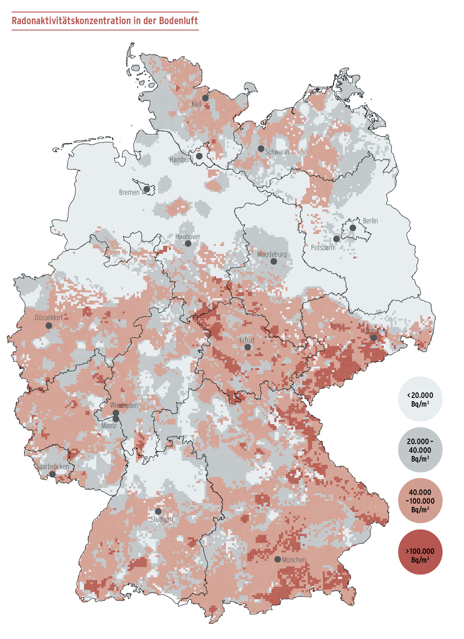 Übersicht über die deutschlandweite Radonkonzentration in der Bodenluft in einem Meter Tiefe.