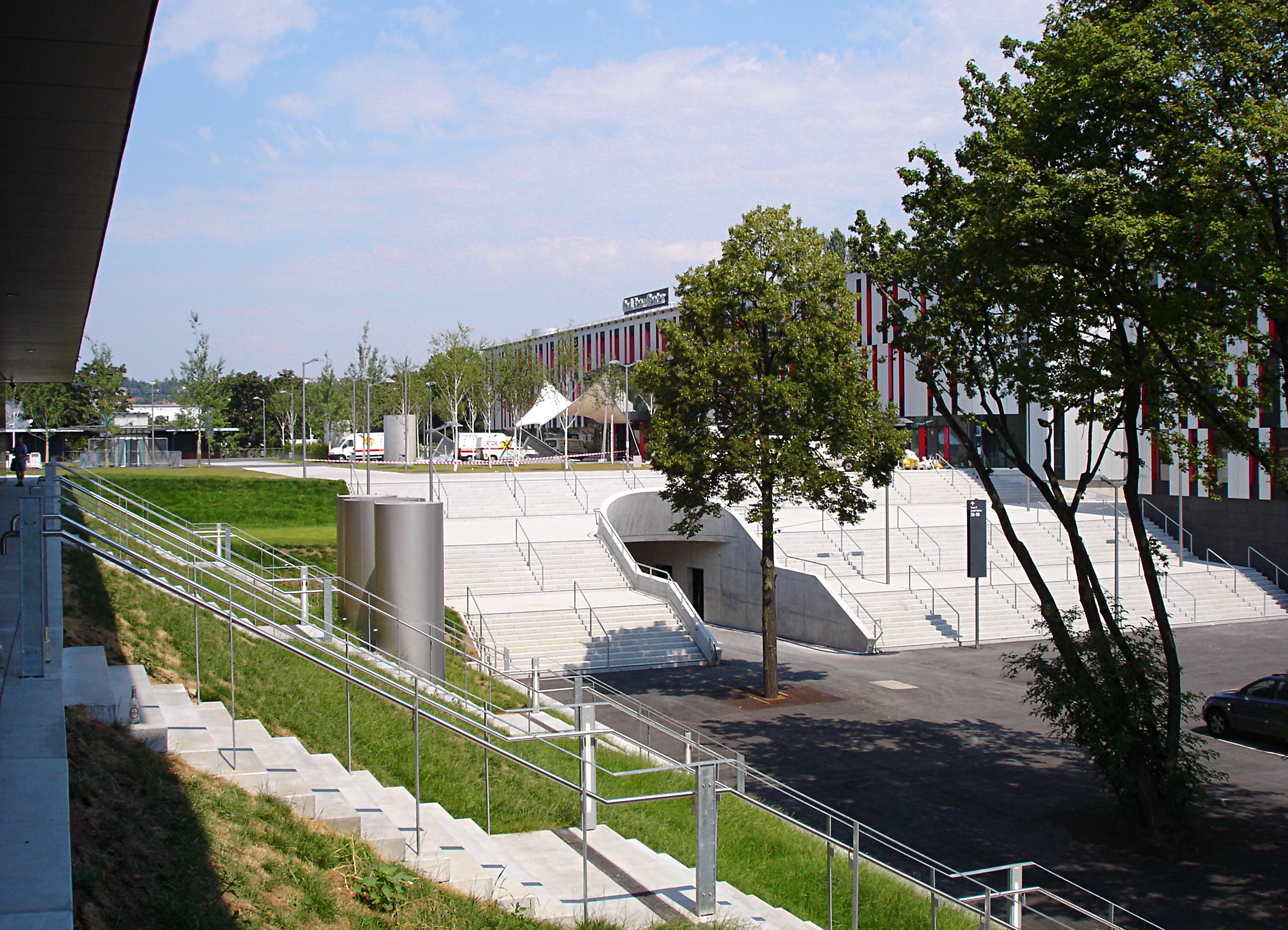 Das Areal vor dem Carl Benz Center wurde als durchgängig intensive Dachbegrünung über der Tiefgarage gestaltet.