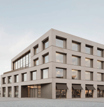 Besonderes Highlight der Leichtbetonfassade ist ihre Farbigkeit und Haptik. So erscheint sie als sehr glatte, homogene Oberfläche, die jedoch im Detail jede Menge Schüttungslagen und Lunker aufweist. „Unser Ziel war es, eine fast natursteinähnliche, travertinartige Oberfläche zu erzeugen, die sich in immer wieder neuen Nuancen voneinander unterscheidet“, erklärt Thomas Steimle. Eine der größten Herausforderungen dabei lag darin, den Liapor-Leichtbeton komplett und homogen zu durchfärben. Daher wurden für die passende Feuchtesättigung die stark saugenden Zuschlagstoffe über Nacht vorgenässt und die Mischung zur einheitlichen Betonmasse erfolgte dann etappenweise. So war sichergestellt, dass der gesamte Leichtbeton homogen farbig erscheint. Im Anschluss wurden die Außenwände betoniert und die Zwischendecken eingestellt. Betoniert wurde immer bis Oberkante Brüstung Fenster, mit einem anschließenden, drei Zentimeter starken Versatz nach außen zum nächsten Geschoss. Als Folge nimmt die Wandstärke von 54 Zentimetern im Erdgeschoss auf 63 Zentimeter im dritten Obergeschoss zu. „Der Versatz wirkt als Schattenkante und die Betonierabschnitte erfahren dadurch eine sehr saubere Gliederung“, so Thomas Steimle. Auf diese Weise wurde eine klare Lineatur um das gesamte Gebäude herum ausgeformt, die sich in der klaren, gerasterten Fassadenstruktur mit den großen Fensteröffnungen fortsetzt.