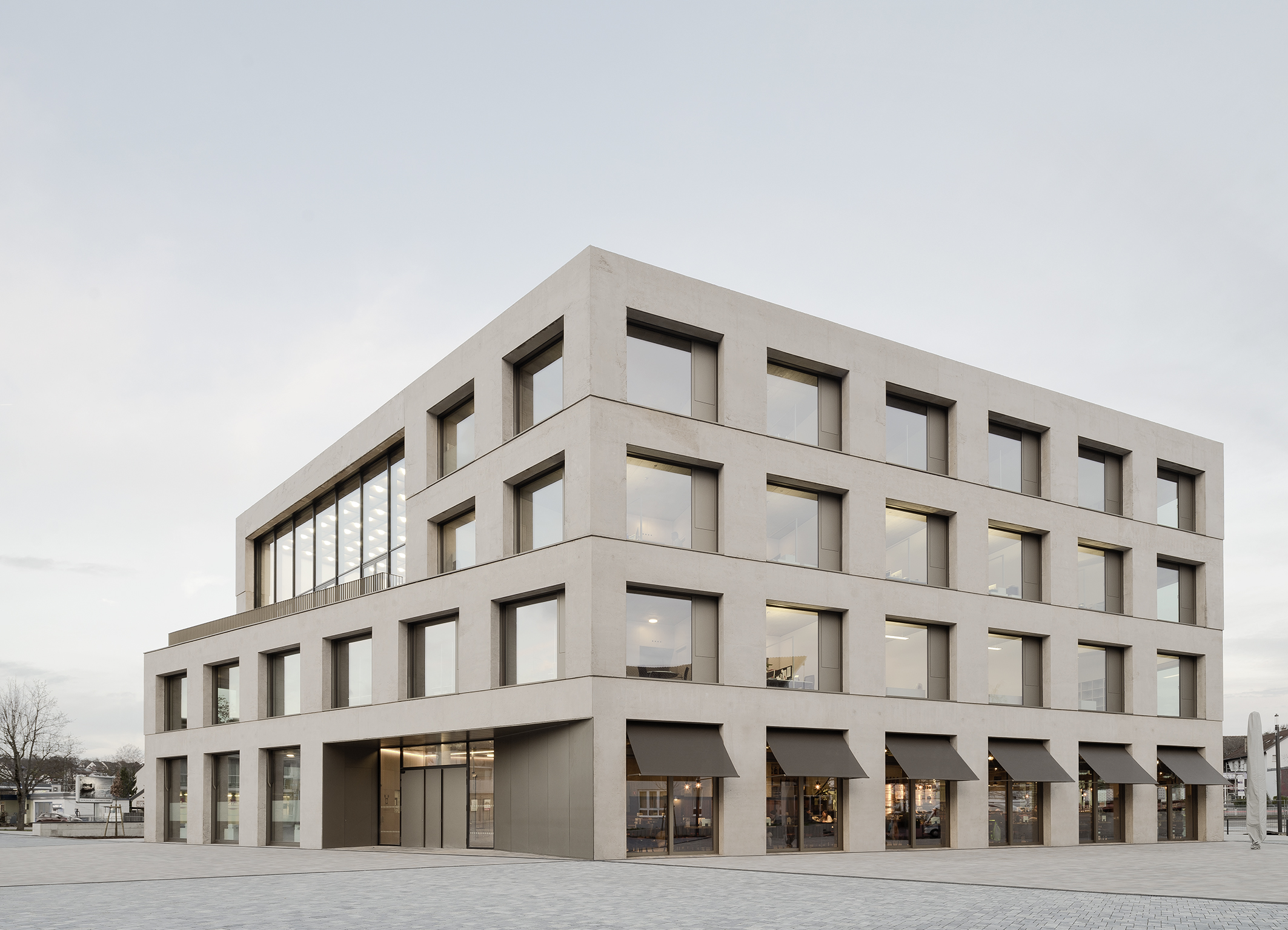 Den Rahmen für das Erleben des Rathauses bildet die sandig-travertinfarbige Gebäudehülle. Sie besteht aus rund 550 Kubikmetern Liapor-Leichtbeton vom Typ LC12/13 mit Liapor F3,5 und Sand K0-4. Der Baustoff, mit dem Steimle Architekten beispielsweise bereits die Bücherei Kressbronn am Bodensee erfolgreich errichteten, kam auch hier ganz bewusst und aus mehreren Gründen zum Einsatz: „Mit dem Leichtbeton konnten wir Tragwerk, Fassade und Dämmung in einer Einheit umsetzen, in einer ehrlichen und authentischen Komposition“, so Thomas Steimle. Auch die positiven Eigenschaften des Liapor-Leichtbetons hinsichtlich Wärmespeicherung und Raumklima spielten eine Rolle. „Die Wand kann die internen Wärmelasten der Verwaltungsnutzung sehr gut aufnehmen und speichern, während die Nachtluftspülung wiederum die Wärme sehr schön wieder freigibt.“ Nicht zuletzt passt der Baustoff auch ideal zur beabsichtigten Wirkung des Objekts. „Die massive, monolithische Gebäudehülle stärkt den Eindruck von Solidität und verankert den Baukörper im und mit dem Ort“, so Thomas Steimle. Durch seine starke bauliche Präsenz definiert das Rathaus die innerstädtische Struktur neu und setzt klare Platzkanten. Dank seines polygonalen Grundrisses weist es dabei keine Rückseite auf.