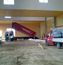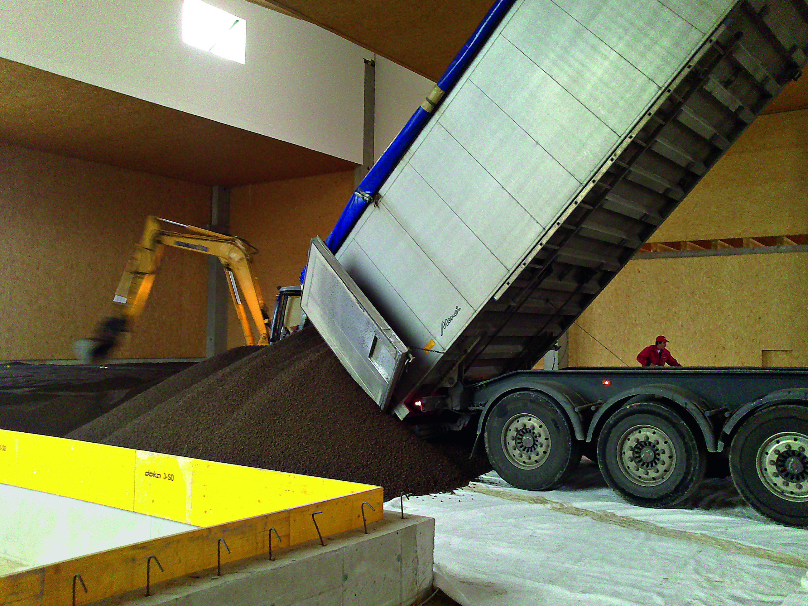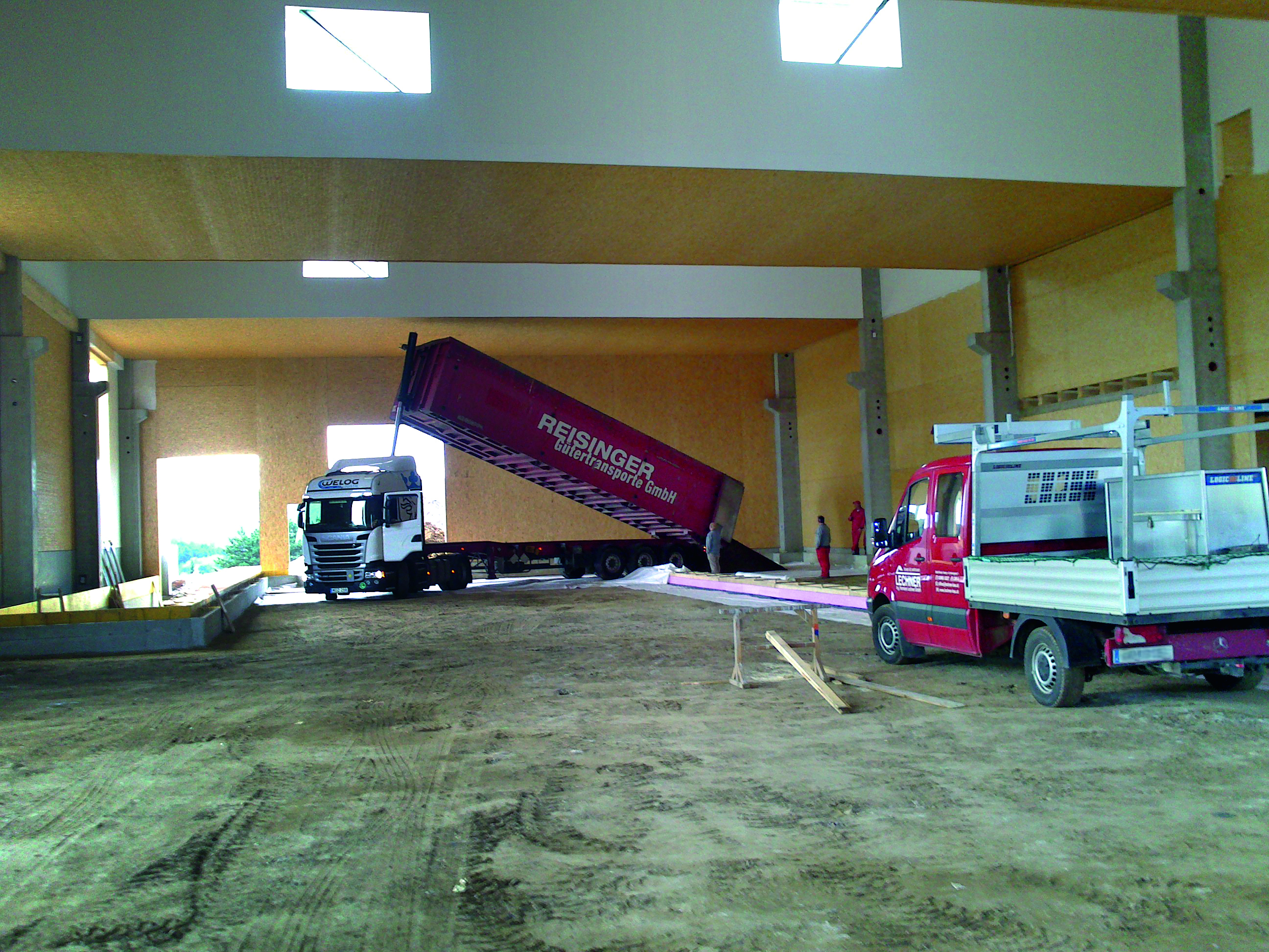 Und auch in Sachen Eintrag und Verarbeitung überzeugte Liapor Ground. Denn das Schüttgut wird besonders wirtschaftlich und einfach per Schubboden-Lkw oder mittels Silo-Lkw und Pumpe an seinen Bestimmungsort verbracht. Auch in der neuen Halle ließ sich Liapor Ground auf diese Weise sicher und gleichmäßig in allen Ecken, Spalten und Rändern verteilen, was optimale Sicherheit und Stabilität in der gesamten Halle gewährleistet. Daneben wirkt Liapor Ground auch wärmespeichernd und ist unempfindlich gegen Feuchte, Frost, Feuer und chemische Einflüsse. Und nicht zuletzt trägt die 45 Zentimeter starke Schicht aus Liapor Ground auch entscheidend zur geforderten Wärmedämmung bei. Zusammen mit den ebenfalls hochwärmedämmenden Holzelementen der Halle weist der gesamte Stahlbetonbau einen Jahresverbrauch von lediglich rund 38 kWh auf.