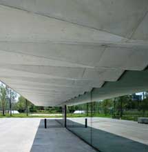 Die einzelnen Ebenen des Schulhauses wurden durch polygonal gewellte Zwischendecken realisiert, deren Unterseiten in Sichtbetonoptik ausgebildet sind. Um gleichzeitig die Gebäudekonstruktion möglichst leicht zu gestalten, kam ein Liapor-Leichtbeton LC35/38 mit einem Liapor-Korn vom Typ F 6,5 und der Korngruppe 2/10 Millimeter zum Einsatz. Er erfüllte die vorgegebene Beton-Trockenrohdichte von 1.600 bis 1.800 kg/m³ optimal, ebenso wie das E-Modul, welches wegen der zu erwartenden Spannungen auf über 18.000 N/mm² angesetzt worden war. Die Entwicklung der entsprechenden Rezeptur übernahm Liapor Schweiz in enger Zusammenarbeit mit den Ingenieuren der Dr. Schwartz Consulting AG, dem Betonlieferanten Eberhard in Rümlang sowie dem Betonzusatzmittellieferanten BASF Construction Chemicals Europe AG in Zürich. Im Vorfeld wurden zahlreiche maßstabsgetreue Decken-Modelle erstellt, die auch die Realisierbarkeit der gewünschten Sichtbetonoptik sicherstellten. Beim Bau der Zwischendecken kamen mit einem Fliessmittel, einem Viskositätsregler und einem Luftporenbildner noch drei BASF-Betonzusatzmittel zum Einsatz. Sie gewährleisteten eine gleichmäßige Verteilung der Liapor-Blähtonkugeln in der Matrix und vermieden ein Aufschwemmen der Körnung. Während der Bauzeit überwachte das LPM Prüflabor Beinwil permanent die Betonqualität. Die Oberflächen des Liapor-Leichtbetons wurden nach Entfernen der Schalungen durch Curing veredelt, bis sie allen ästhetischen Anforderungen des Bauherrn und des Architekten genügten.