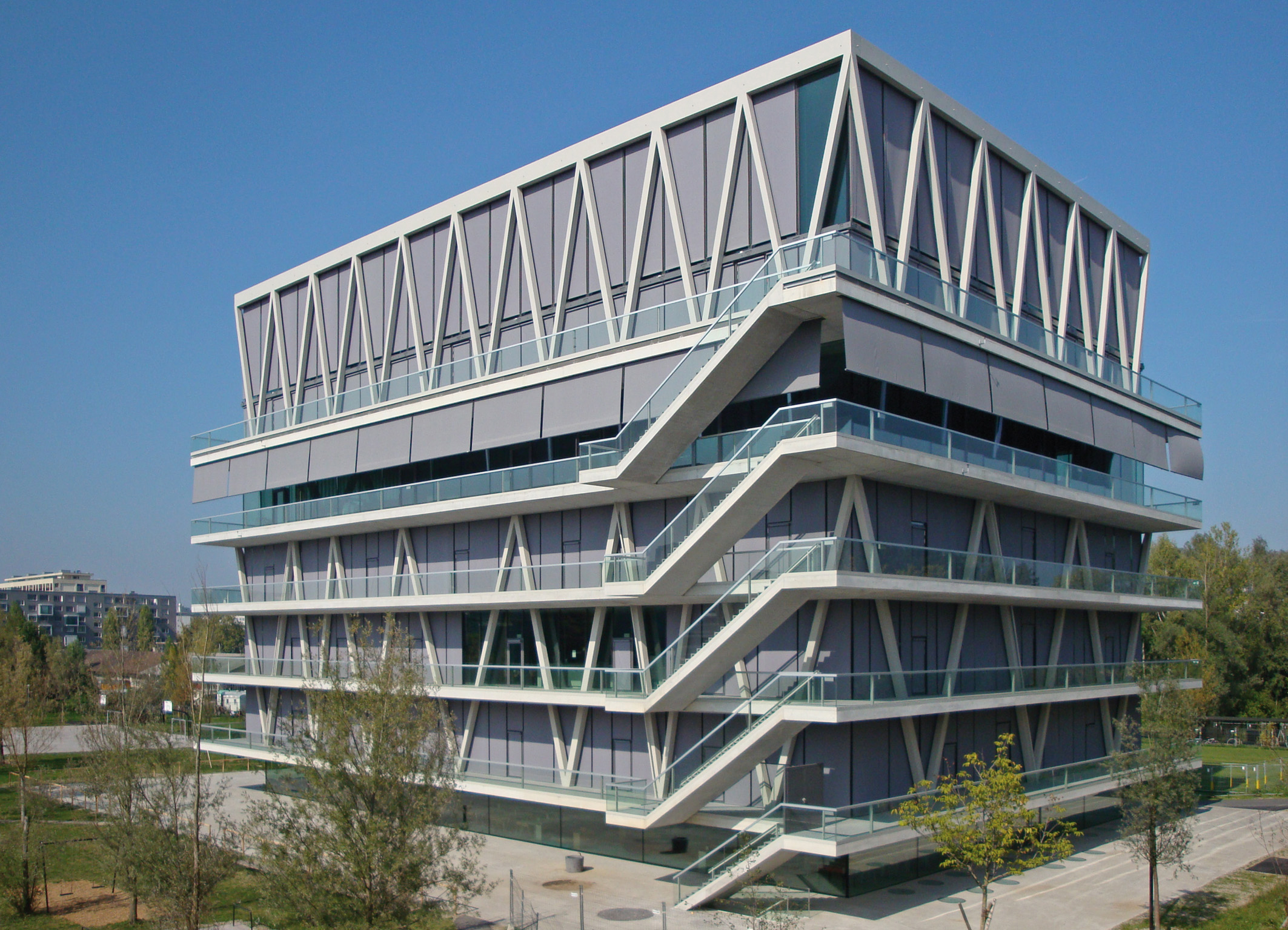 "Die Konstruktion ist vergleichbar mit einem Tisch, das vierte Obergeschoss bildet dabei die Tischplatte", erklärt Christan Kerez. "Der gesamte Unterrichtstrakt hängt an den Fachwerken des vierten Obergeschosses und bildet ein mehr als zehn Meter auskragendes Dach." Insgesamt verfügt der 30 Meter hohe Gebäudekubus über fünf Geschossen in Stahlbauweise, die Hauptlast lagert auf lediglich sechs dreibeinigen, raumhohen Stützen im Erdgeschoss. Über ihnen befinden sich die beiden Stahlträger-Fachwerkverbände der unteren drei Stockwerke, gefolgt von den quer dazu angeordneten beiden Stahlträgerverbände des vierten Stockwerks. Diese Konstruktion erforderte die Anordnung der stützenfreien, in ihren Abmessungen vorgegeben Doppelturnhalle auf dem Dach des Gebäudes. Gleichzeitig ermöglichte das Baukonzept eine Grundfläche der Schule von nur 50 auf 34 Metern.