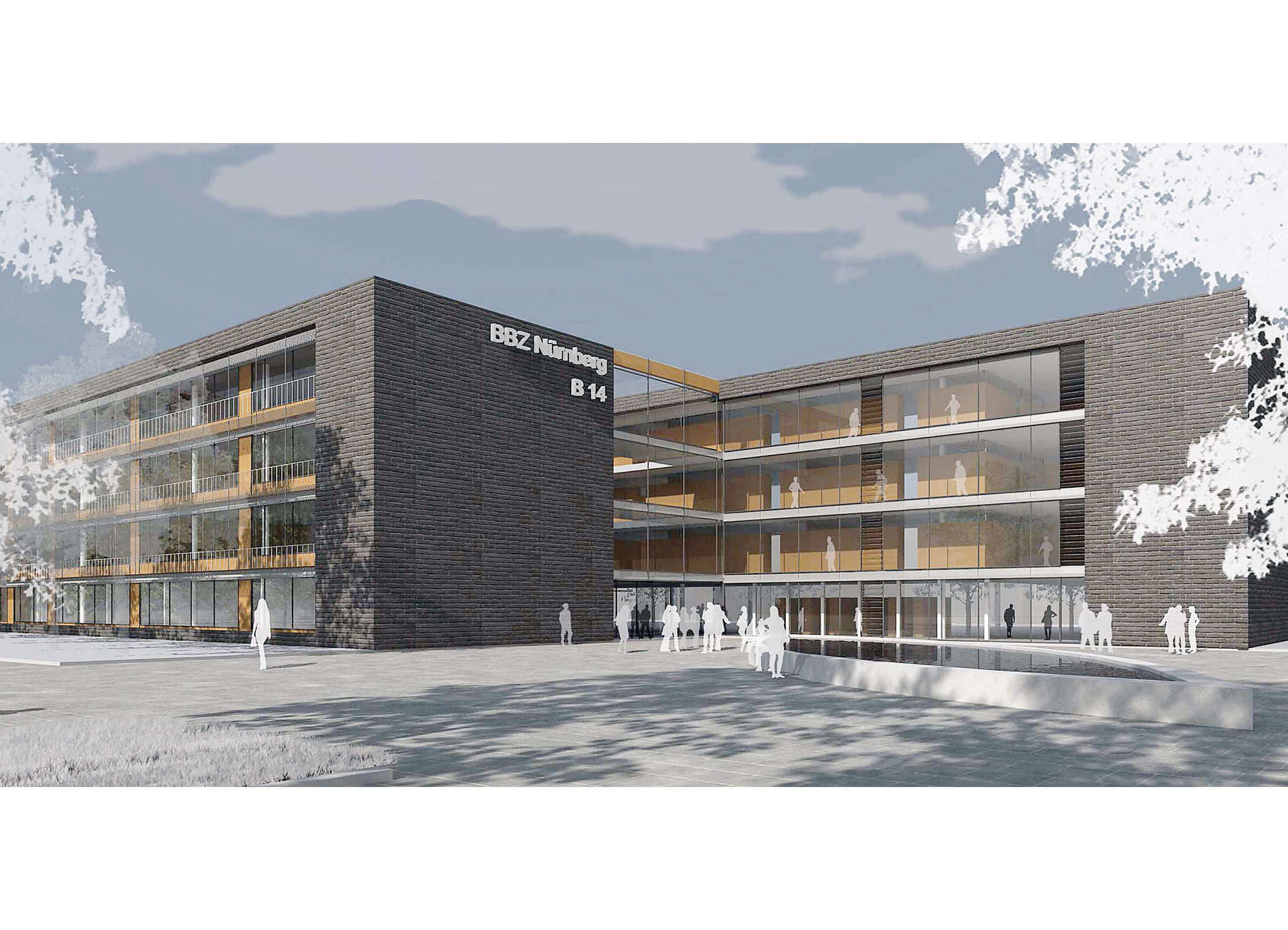 Die neue Berufliche Schule B 14 in Nürnberg ist ein viergeschossiger Flachdachbau, bestehend aus zwei separaten Gebäuderiegeln.