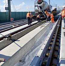Besondere Bedeutung kam beim Brückenbau dem Bereich zwischen den beiden Schienensträngen zu. Eine Verfüllung mit Schottersteinen kam von vornherein nicht infrage, da diese speziell bei hohen Fahrgeschwindigkeiten von den Zügen angesaugt werden und diese beschädigen. Gleichzeitig galt es, den Oberbau als befahrbare Spur auszubilden, damit im Notfall Einsatzfahrzeuge auf die Brücke gelangen können. "Gefragt war ein stabiler, dennoch leichter Baustoff, der zudem auch drainagefähig sein musste, um bei Starkregen Wasseransammlungen auf der Brücke zu vermeiden", erklärt Peter Bednarek von der FBA Fertigbeton Anhalt GmbH & Co.KG. "Die Lösung boten rund 1.500 Kubikmeter haufwerksporiger Liapor-Leichtbeton mit UK braun 4-8 mm sowie einer weiteren Gesteinskörnung."