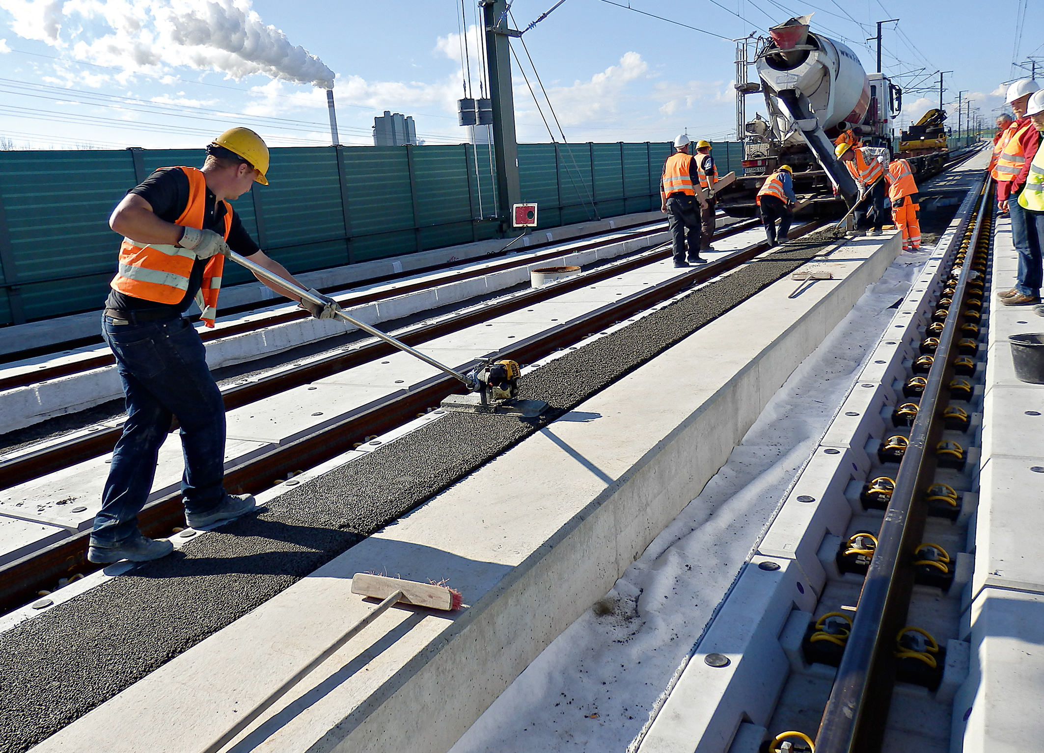 Mit einer Rohdichte von 1,2 t/m³ liegt der verwendete Liapor-Leichtbeton unterhalb des statisch zulässigen Höchstwerts, bietet mit einer Festigkeit von 7 N/mm² aber auch gleichzeitig die geforderte Stabilität. Dank seines haufwerksporigen Gefüges ist außerdem die schnelle und sichere Wasserableitung selbst großer Flüssigkeitsvolumina sichergestellt. Entwickelt wurde der Liapor-Leichtbeton in enger Abstimmung mit Liapor vom TBR Technologiezentrum GmbH & Co. KG in Bernburg sowie der FBA Fertigbeton Anhalt GmbH & Co. KG in Landsberg, die den Baustoff auch anlieferte. Für die Verarbeitung war die Porr Deutschland GmbH zuständig.