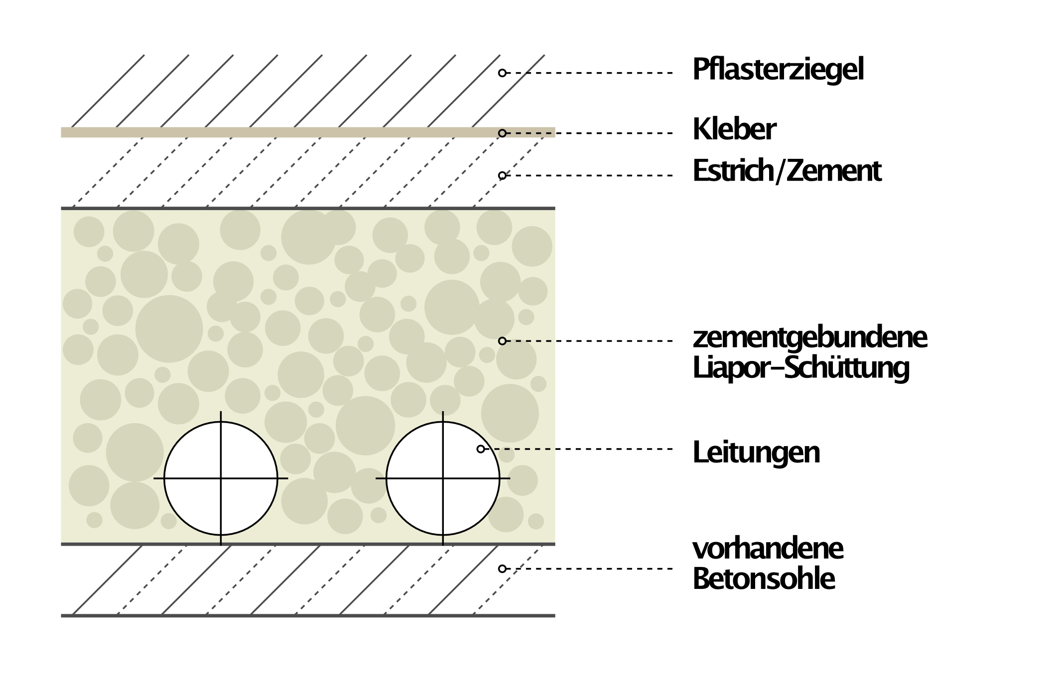 Den oberen Abschluss der Auffüllung bilden Pflasterziegel. Darunter befinden sich ein Zementestrich, eine Klebeschicht und die Liapor-Schüttung.
