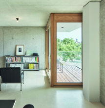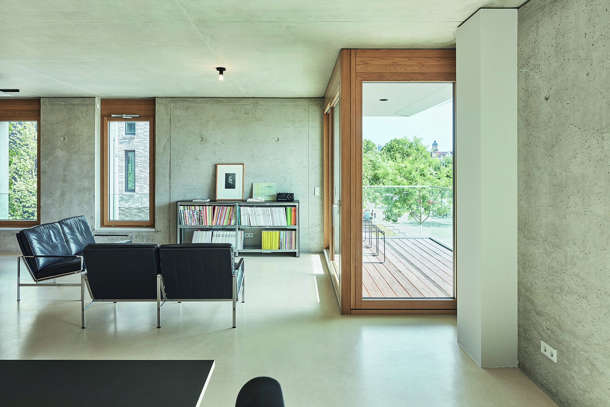 Mit insgesamt 270 m³ trägt die große Masse des Liapor-Leichtbetons – als weiterer Grund für die Baustoffwahl – auch entscheidend zum hohen Wohn- und Nutzungskomfort des Gebäudes bei: „Durch ihre große Masse und die hohe Wärmespeicherkapazität des Liapor-Leichtbetons wirkt die Gebäudehülle wie ein großer Wärmepuffer. Sie sorgt für ein ausgeglichenes, behagliches Raumklima, in dem wir uns alle sehr wohlfühlen“, so Franz-Josef Mattes und Steffen Wahl. Das gilt auch für die vielen heißen Tage des Sommers 2022: „Selbst während der extremen Hitzeperioden herrschten im Gebäude sehr angenehme Temperaturen. Es war immer eine Wohltat, von der Hitze draußen in die Grüne Ecke zu kommen“, so die Architekten, die mit ihrem Team seit März 2020 die beiden unteren Geschosse als Architekturbüro nutzen.