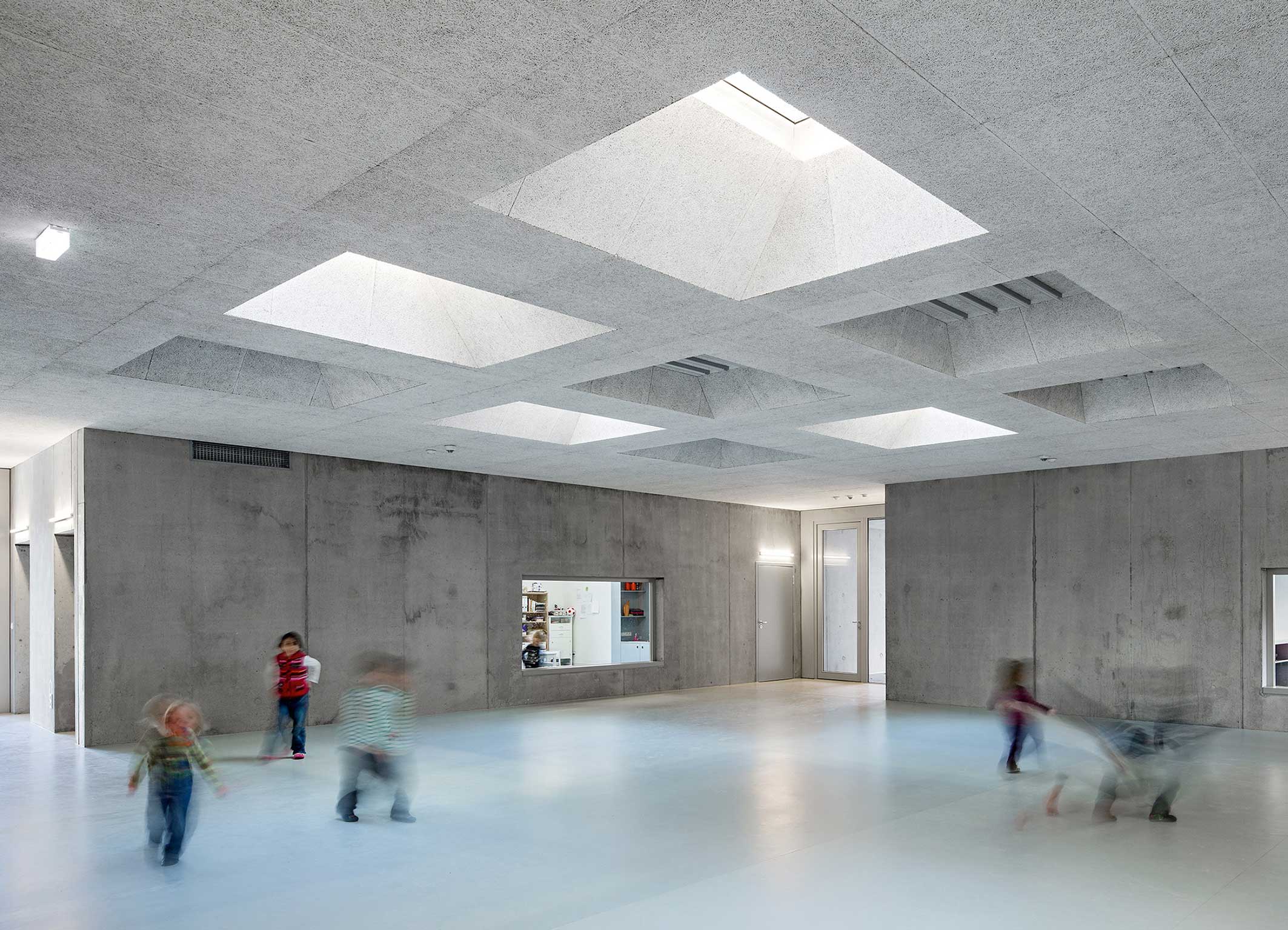 Ein schlichter Quader in dezentem Farbton, der gleichzeitig Massivität und Kompaktheit ausstrahlt – das war einer der Grundgedanken des Berliner Architekten José Gutiérrez Marquez für den Bau der Kindertagesstätte "KinderUniversum" in Karlsruhe. Genauso wichtig war es aber auch, den Kindern mit dem Bau jede Menge Freiräume zum Spielen, Lernen und Entdecken zur Verfügung zu stellen. Umgesetzt wurde der Neubau mit seinen 115 Kinderbetreuungsplätzen als viergeschossiger Gebäudekubus in monolithischer Ausbildung und heller Sichtbetonoptik.