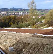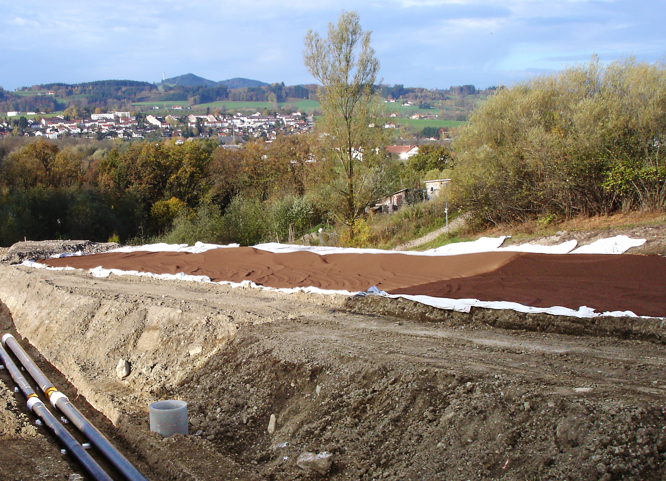 Die Liapor-Blähtonkörnung wurde zwischen den beiden bis zu vier Meter hohen Erdwällen eingebracht und mit einem Schutzvlies versehen.