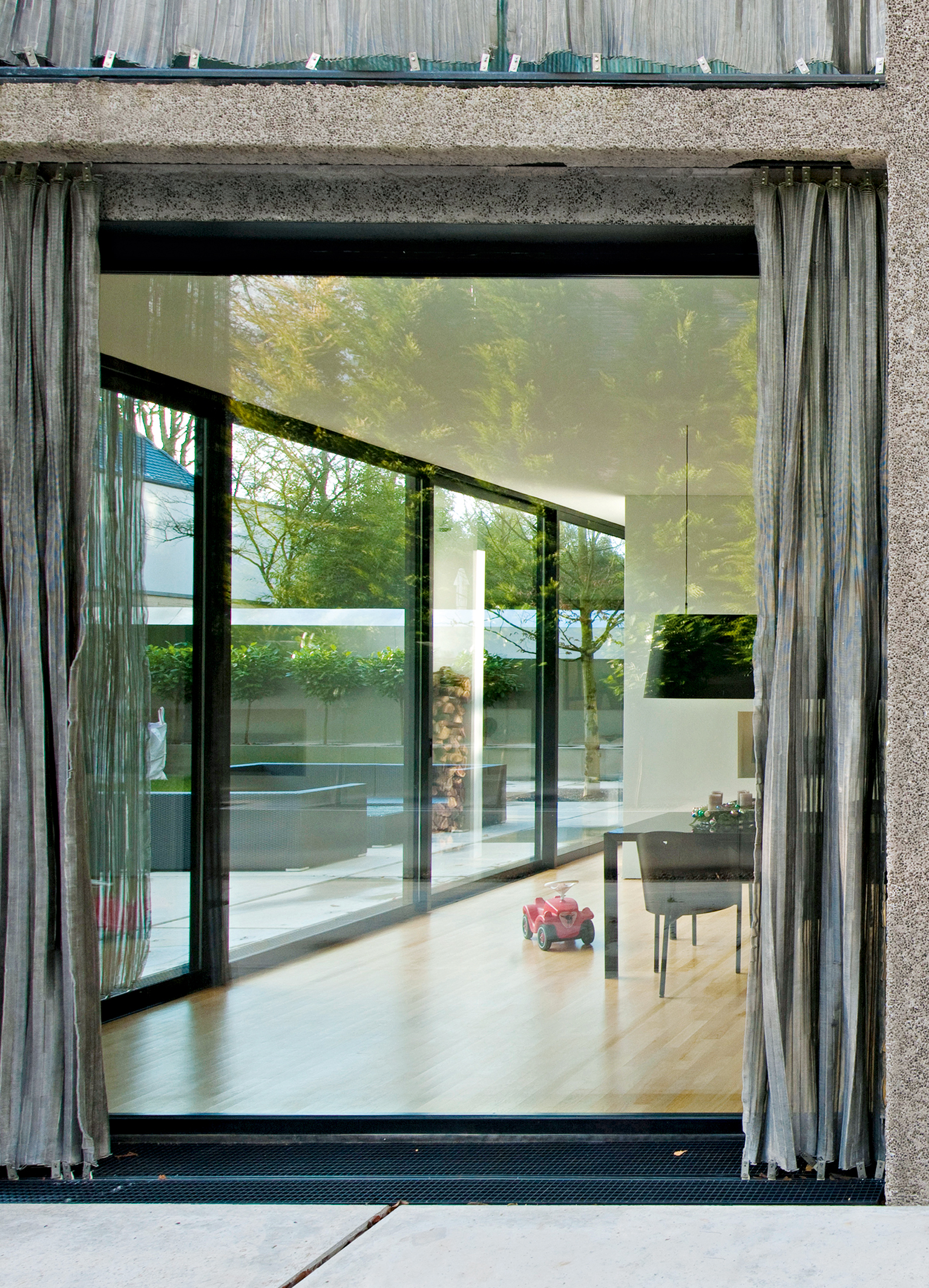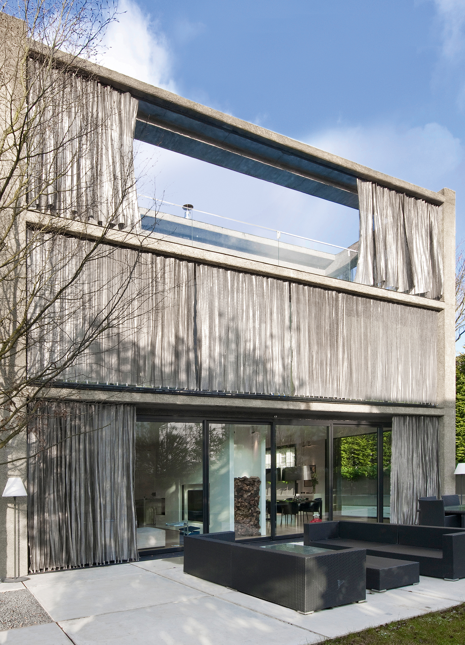 Die silbernen Stahlblechvorhänge passen ideal zur eingefärbten Sichtbetonfassade des Objekts.