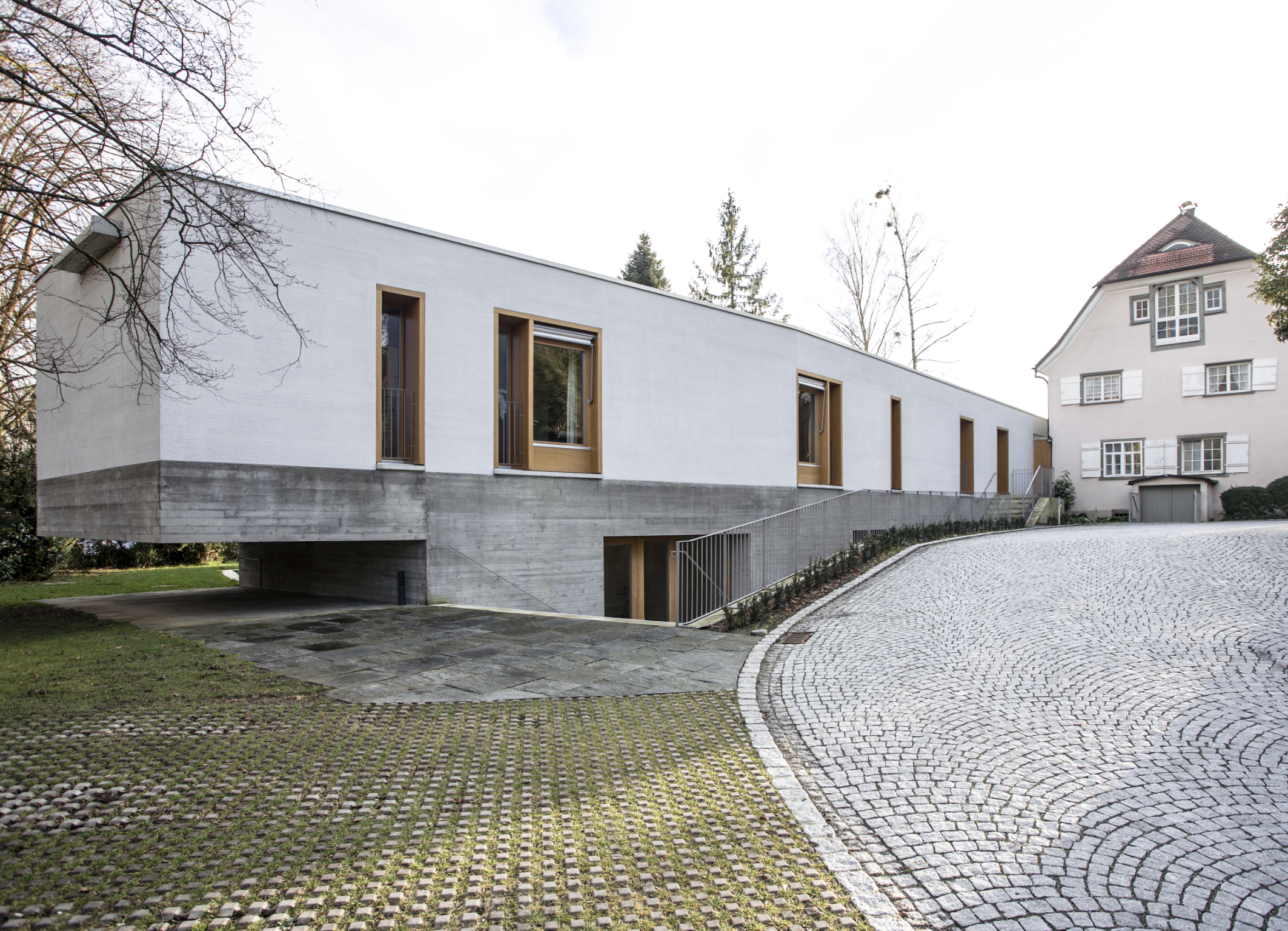 Optisch erscheint der Anbau horizontal zweigeteilt mit seinem Obergeschoss aus weiß verputztem Ziegelmauerwerk und hellgrauem Sockelgeschoss. Dieses besteht aus Liapor-Leichtbeton in 70 Zentimetern Stärke. Die Wahl des Materials erfolgte aus mehreren Gründen: „Zum einen wollten wir monolithisch ohne zusätzliche Kunststoffdämmung bauen und auf das bewährte Prinzip der passiven Konditionierung mit schweren, langlebigen, natürlichen Bauteilen und hoher thermischer Speicherkapazität setzen,“ erklärt Prof. Dipl.-Ing. Architekt Andreas Gierer. „Zum andern musste aufgrund des im Boden fließenden Hangwassers das Sockelgeschoss als ,Weiße Wanne‘, also wasserdicht, beziehungsweise mit hohem Wassereindringwiderstand ausgeführt werden. Für diese Anforderungen bot der Liapor-Leichtbeton die passende Lösung.“ Die verwendete sägeraue Brettschalung sorgt dabei für die ganz eigene Struktur der Sichtflächen.