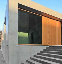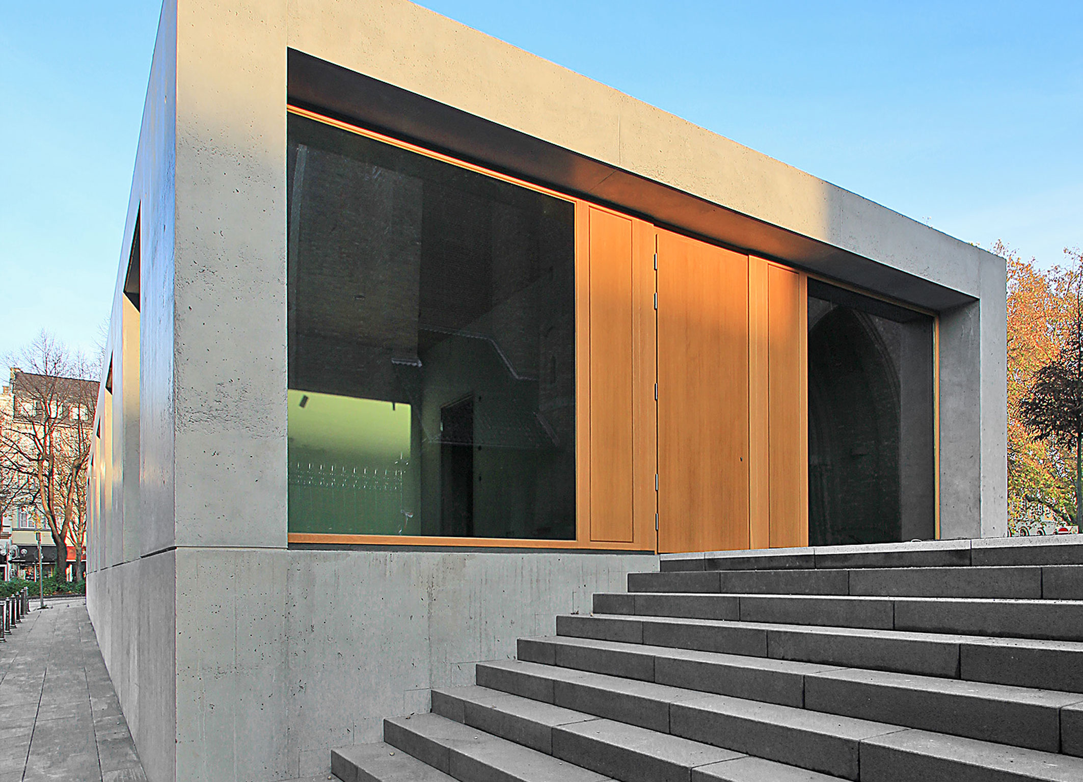 Am ersten Advent im Dezember 2014 wurde am Bonner Kaiserplatz der neue Kirchenpavillon des Evangelischen Kirchenkreises Bonn in einem feierlichen Festakt eingeweiht. Das neue Gebäude umfasst das Stadtkirchencafé sowie eine Informations- und Beratungsstelle und befindet sich an der Längsseite des Kaiserplatzes vor der Bonner Kreuzkirche. "Die Dimension des Kirchenpavillons ist so beschaffen, dass er dient und keines der Kirchenportale den Blicken vom Kaiserplatz her entzieht", erklärt Architekt Jochem Kastner von Kastner Pichler Architekten, die das rund 1,3 Millionen teure Projekt planten und umsetzten. "In seiner Modernität zeigt er sich offen für Zukünftiges, bleibt aber in seiner Gestaltung zeitlos." Der quaderförmige, monolithische Baukörper begrenzt mit seiner Längsseite den Kaiserplatz, öffnet sich aber auch über die zahlreichen raumhohen Fenster dorthin. Die Fenster vermitteln im Wechselspiel mit den massiven, 60 Zentimeter mächtigen Außenwänden Rückzugsmöglichkeiten, Ruhe und Offenheit.
