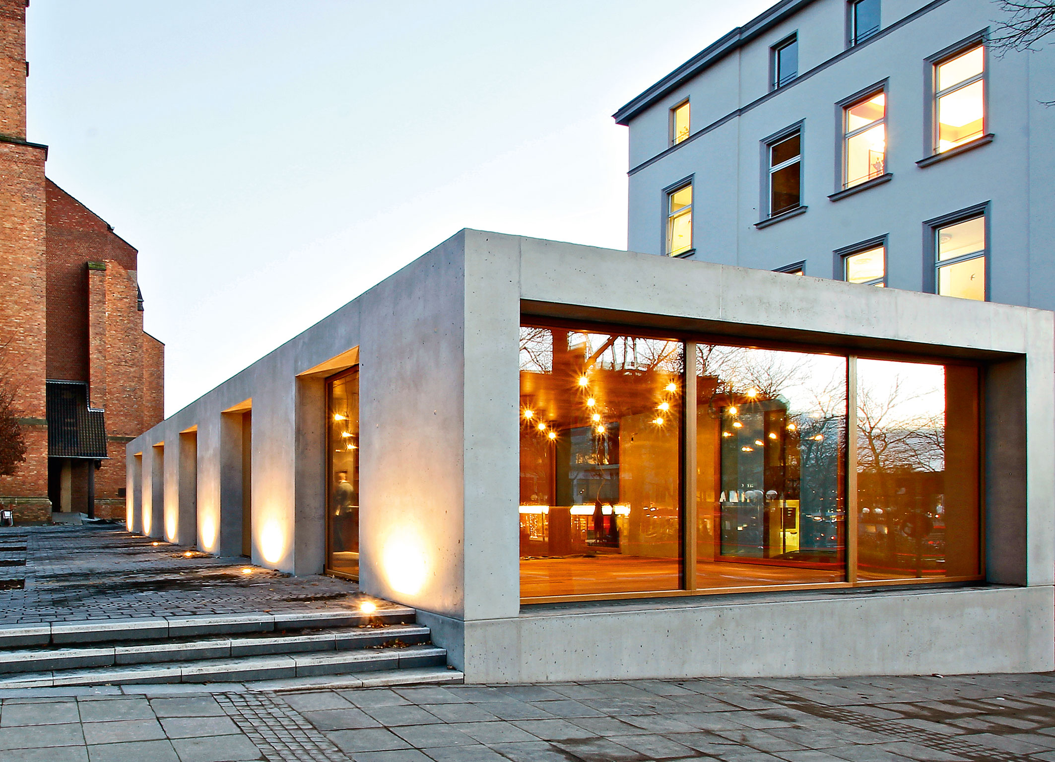 Die Sichtbetonoptik sowie die großformatigen Fenster geben dem Kirchenpavillon sein unverwechselbares Gesicht.