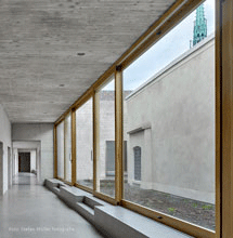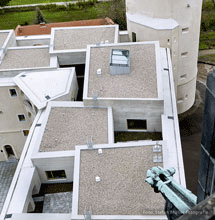 Beim Bau des neuen Predigerseminars auf dem Dach des Wittenberger Schlosses entschieden sich Bruno Fioretti Marquez Architekten für Liapor-Leichtbeton. Er passt perfekt zum massiven, monolithischen Geist des Hauses, erfüllt aber auch die bauphysikalischen Vorgaben. Die einschalige Bauweise machte außerdem die Bauausführung in der Praxis besonders einfach. So wurden sämtliche Gebäudehüllen der sieben Quader aus Liapor-Leichtbeton errichtet. Dabei kamen rund 650 Kubikmeter eines LC12/13 D1.2 mit Liapor-Körnung F3,5 und Leichtsand zum Einsatz. Die Stärke der Außenwände liegt zwischen 24 und 76 Zentimetern, die der Innenwände zwischen 20 und 30 Zentimetern. Auch die Unterdecken bestehen aus Liapor-Leichtbeton mit 20 bzw. 24 Zentimetern Mächtigkeit.