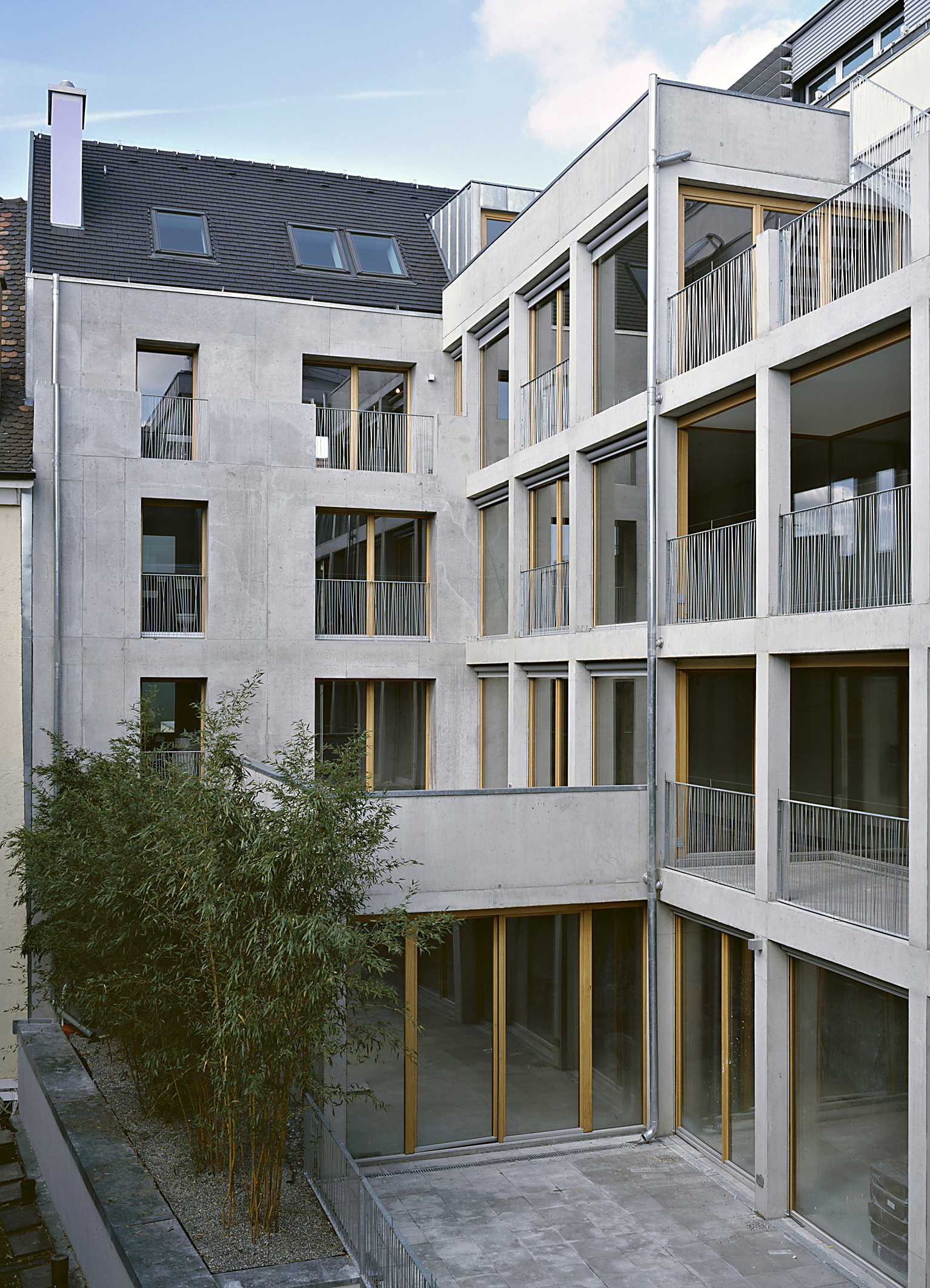 Die Altstadt von Konstanz zählt zu den bedeutendsten mittelalterlichen Stadtensembles in Baden-Württemberg. Sie ist gekennzeichnet durch vielfältige, historisch gewachsene Bauten und Strukturen, die über die Jahrhunderte hinweg bis heute größtenteils erhalten sind. Im zentralen, größten mittelalterlichen Gebäudeblock der Konstanzer Altstadt wurden 1961 das barocke Stadtpalais der vorderösterreichischen Landesregierung sowie verschiedene kleinere Wohngebäude abgerissen und der Block durch zwei Gassen in vier kleine Blöcke zerteilt. In der Hussenstraße lag seitdem zwischen fünfgeschossigen Bauwerken eine zehn Meter breite und 30 Meter tiefe Parzelle brach, auf der vor Kurzem unter der Bauherrschaft der Doser+Partner Baugesellschaft mbH ein viergeschossiges Wohn- und Geschäftshaus errichtet wurde. Entworfen von den Kraus Schönberg Architekten, setzt das monolithische, aus Liapor-Leichtbeton in Sichtbeton-Optik bestehende Gebäude mit seiner klar definierten Front aus vertikal und horizontal angeordneten Betonstelen einen ganz besonderen Akzent in der Konstanzer Altstadt. Das Wohnhaus schließt den Block zur Straße hin ab, ein Hof schafft Distanz, um das Gebäude von Süden komplett belichten zu können. Ein Laubengang bietet bespielbare Außenflächen in einem fast komplett überbauten Grundstück und erschließt die Gartenterrassen und das Gartenhaus im rückwärtigen Bereich.