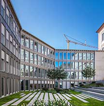 Im Inneren präsentiert sich das Objekt als vierstöckiger heller Verwaltungsbau.
