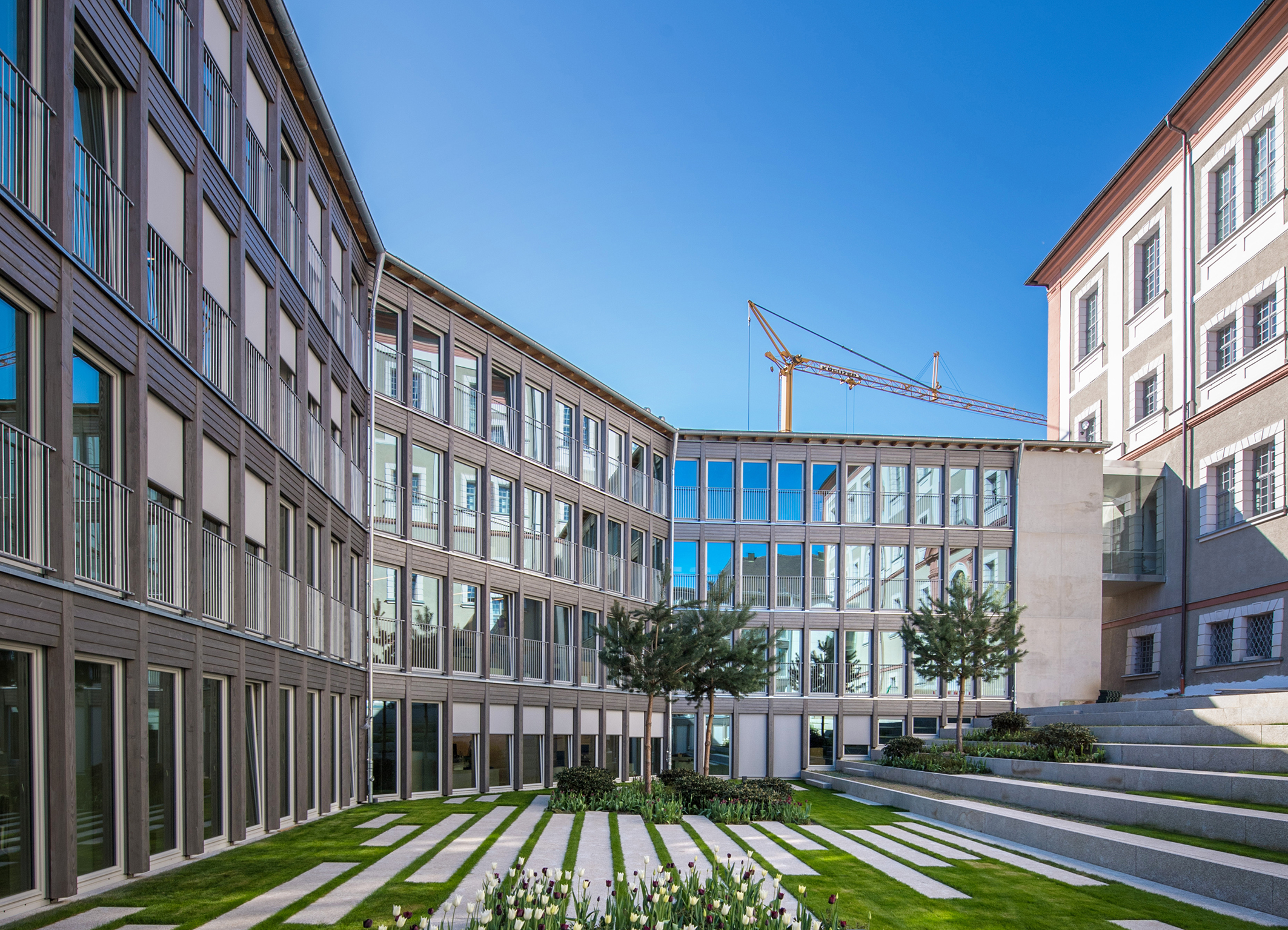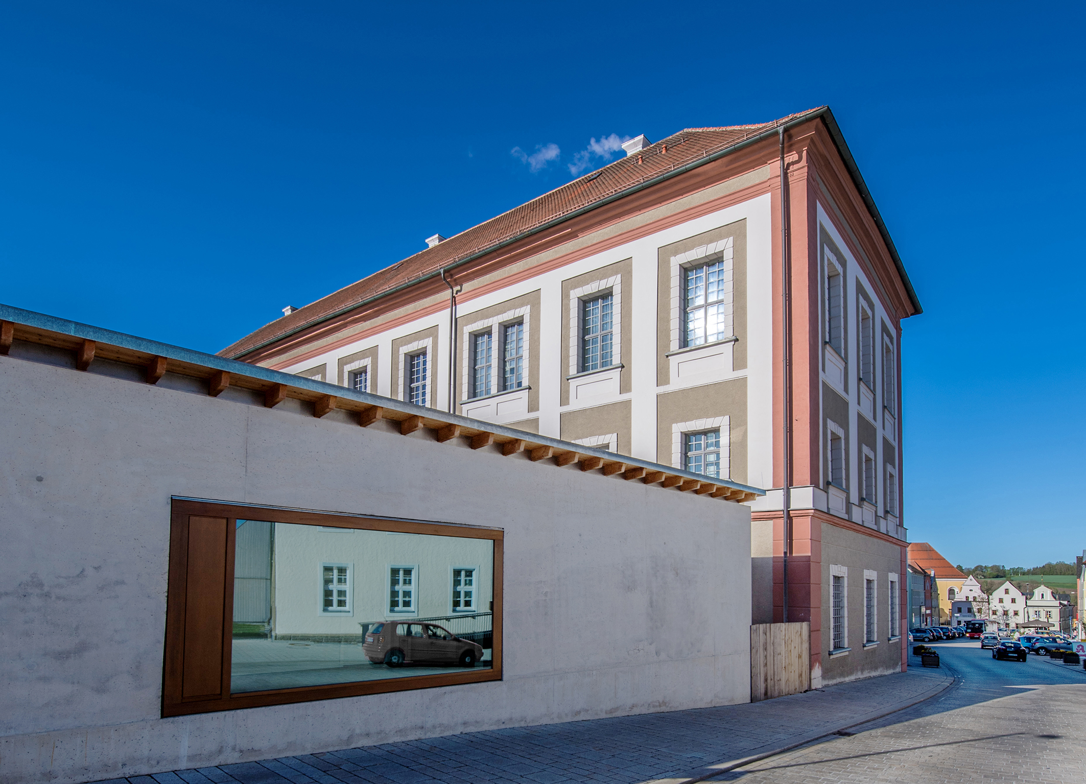 Sechs Architekturbüros waren 2016 angetreten, um dem Landkreis ihre Konzeptionen für den Erweiterungsbau des Landratsamts Neustadt an der Waldnaab zu präsentieren. Das Ziel war klar: Direkt neben dem historischen Stadtschloss sollte ein neuer Verwaltungsbau mit rund 100 Arbeitsplätzen entstehen, der die Enge und überalterte Ausstattung des bestehenden Kreiskassengebäudes beendet und die gesamte Landkreisverwaltung wieder in der Ortsmitte von Neustadt vereint. Durchsetzen konnte sich schließlich das Architekturbüro Bruno Fioretti Marquez aus Berlin. Sie zeigten als einziges Büro keinen eigenständigen Baukörper, sondern einen C-förmigen Erweiterungsbau, der über zwei seitliche Durchgangsfugen bzw. Glasbrücken direkt an die Längsseite des Schlosses anbindet. Der Anbau reicht in seiner Höhe dabei lediglich bis zu dessen Sockelgeschossdecke und lässt so den respektvollen Blick auf die oberen beiden Stockwerke des Baudenkmals frei. Gleichzeitig nutzt der Neubau geschickt die bestehende Topografie und entwickelt sich – von außen betrachtet – von einem eingeschossigen zu einem viergeschossigen Baukörper. Extrem unterschiedlich erscheinen deshalb auch die Innen- und Außenseiten des Gebäudes. So präsentiert sich auf der Innenseite der Erweiterungsbau mit der viergeschossigen leichten Holzfassade und den raumhohen Verglasungen als moderner, nachhaltiger und heller Verwaltungsbau. Dank seines Grundrisses bildet er gleichzeitig einen atriumartigen Innenhof mit großer Freitreppe aus. Durch die beiden seitlichen Durchgänge an den Schlossseiten ist dieser Raum öffentlich zugänglich und vielseitig für unterschiedlichste Veranstaltungen nutzbar.