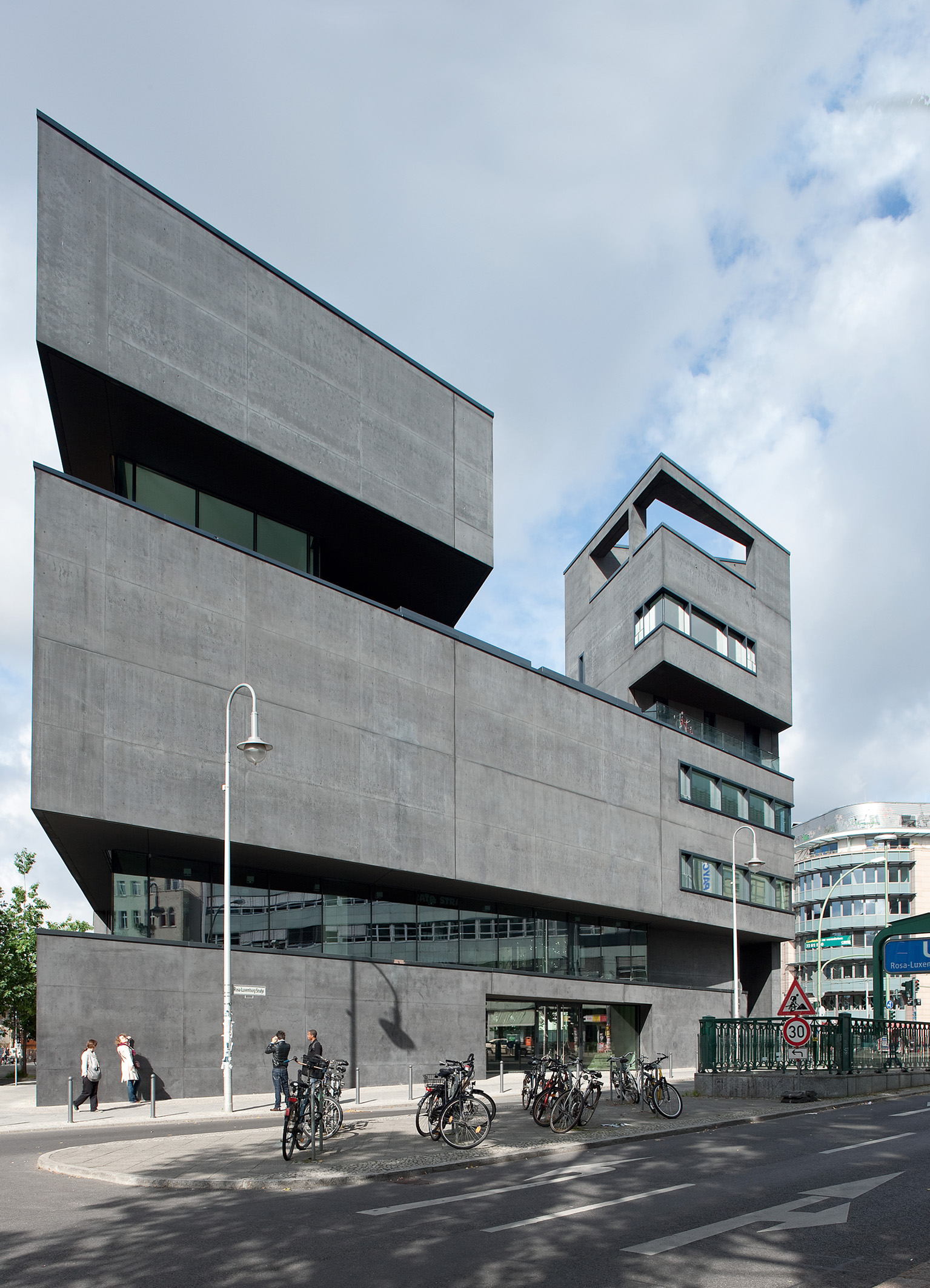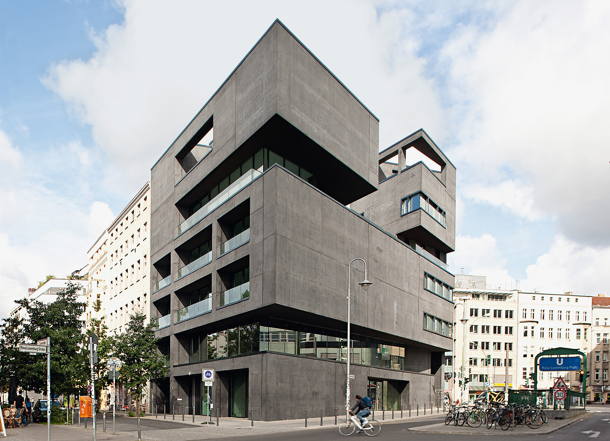 Mit dem neuen Wohn- und Geschäftshaus am Berliner Rosa-Luxemburg-Platz konzipierte Architekt Roger Bundschuh zusammen mit der Künstlerin Cosima von Bonin einen skulpturalen, wie aus einem Block geschnittenen Bau. Für die besondere Ausstrahlung des Objekts sorgt auch die Fassade in schwarzer Sichtbeton-Optik aus Liapor-Leichtbeton, dessen besondere bau-physikalischen Eigenschaften auch erst die Umsetzung der komplexen Gebäudegeometrie ermöglichten.
