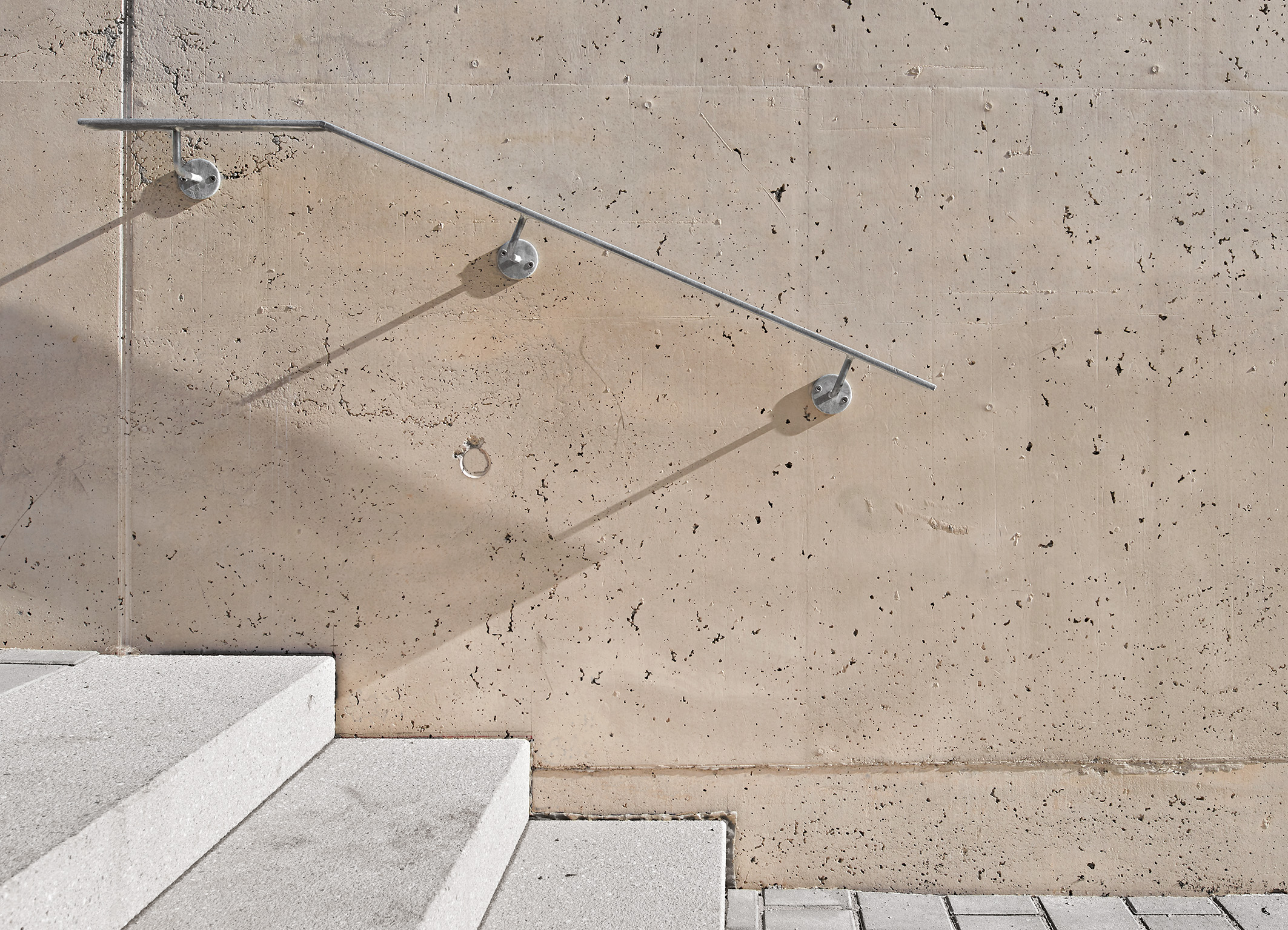 Sämtliche Innen- und Außenwände wurden in 61,5 Zentimetern Stärke aus Liapor-Leichtbeton errichtet. Zum Einsatz kamen rund 856 Kubikmeter eines LC12/13 der Rohdichteklasse 1.2. Er besteht aus einer Liapor-Blähtonkörnung F3,5 2-8 mm, Liapor Sand K 0-4, Zement CEM III/B 32,5 N, Steinmehl und gelber Flüssigfarbe. „Der Leichtbeton wurde eingefärbt, um dem Haus den gewünschten speziellen sandfarbenen, muschelkalkartigen Charakter verleihen zu können“, so Johannes Weiß. „Damit wollten wir zeigen, dass Beton auch fast so aussehen kann wie ein Naturstein.“ Und dafür sorgt nicht nur die Farbigkeit des Baustoffs, sondern auch dessen ganz besondere Ausprägung. So weisen sämtliche Betonoberflächen ganz bewusst besonders viele Lunker auf, die dank der entsprechenden Blasen und Hohlräume die Wände außerordentlich lebendig wirken lassen. Als Orientierung diente die kürzlich fertiggestellte Neuapostolische Kirche in Bad Cannstatt, deren eingefärbte Leichtbetonwände ebenfalls eine besonders lunkerartige Oberflächenstruktur aufweisen.