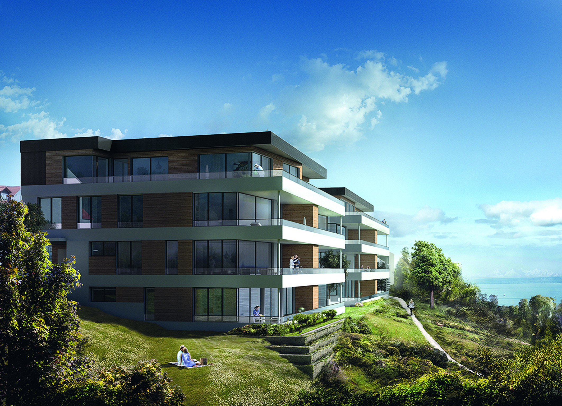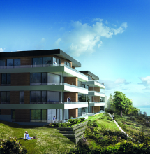 Von den Weinreben am Hang über die spiegelnde Wasserfläche des Bodensees bis hin zu den schneebedeckten Gipfeln der Schweizer Alpen – dieser spektakuläre Ausblick wird eines der Hauptmerkmale der neuen Lake Lofts in Meersburg sein, die zurzeit von der Ebner Wohn- und Städtebau GmbH in Fellbach auf dem Gelände eines ehemaligen Hotels errichtet werden. Die Hanglage auf den sandig-tonigen Sedimenten der Oberen Meeresmolasse erforderte jedoch umfangreiche Vorarbeiten bei der Gründung der beiden vierstöckigen Gebäude mit insgesamt elf Wohnungen. Um insbesondere Rutschungen des Untergrunds entgegenzuwirken, wurde der Hang im rückwärtigen Teil der Neubebauung mittels Bohrpfählen und Spritzbeton sowie im oberen Bereich mittels Berliner Verbau gesichert.