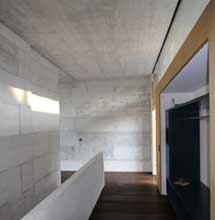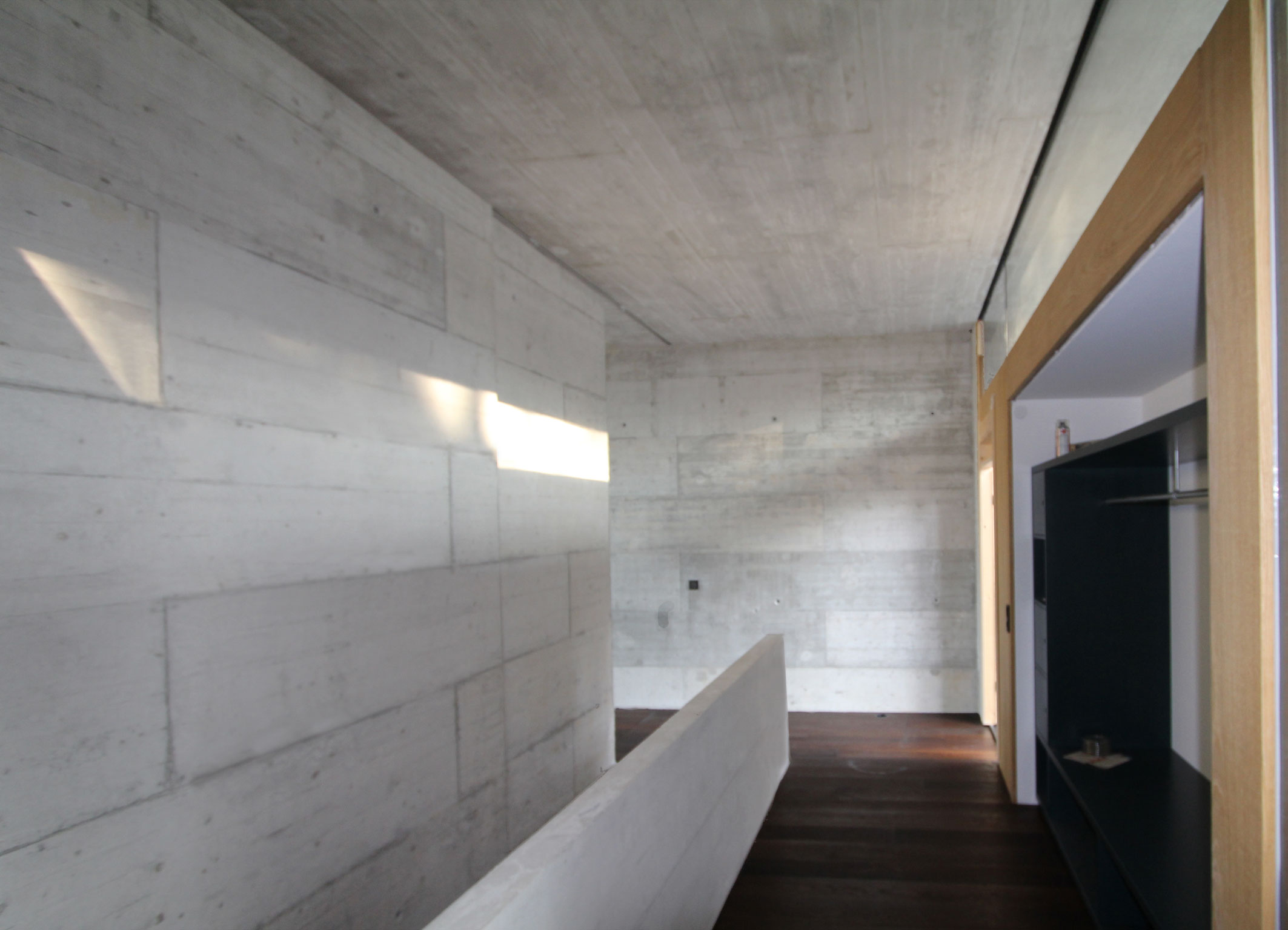Der obere Gebäudeteil erscheint wie aus einem Block geschnitten, praktisch fugenlos und wirkt damit besonders flächig und kompakt. "Der Anspruch, die Wände so perfekt wie möglich auszuführen und das gesamte Objekt als homogenen Baukörper erscheinen zu lassen, wurde perfekt umgesetzt", so das Fazit von Markus Haug. "Die Betonage erfolgte mithilfe von Schalmatrizen in Form von OSB-Platten, die zur besonderen Oberflächenästhetik beitragen." Alle Wände wurden nach Entfernung der Schalung so belassen und nicht weiter behandelt. Während die Sichtbetonflächen von ganz nah betrachtet ein lebendiges, abwechslungsreiches Strukturspiel offenbaren, wirken sie aus der Entfernung sehr ruhig und gleichmäßig. Das gilt für den Außenbereich ebenso wie für das Innere des Hauses, wo der rohe Beton perfekt mit dem Eichenholz des Fußbodens, der Türen und den Fenstern harmoniert. Die Aluminiumschalen der Fensterkonstruktionen sind in einem kühlen Eloxalton gehalten.