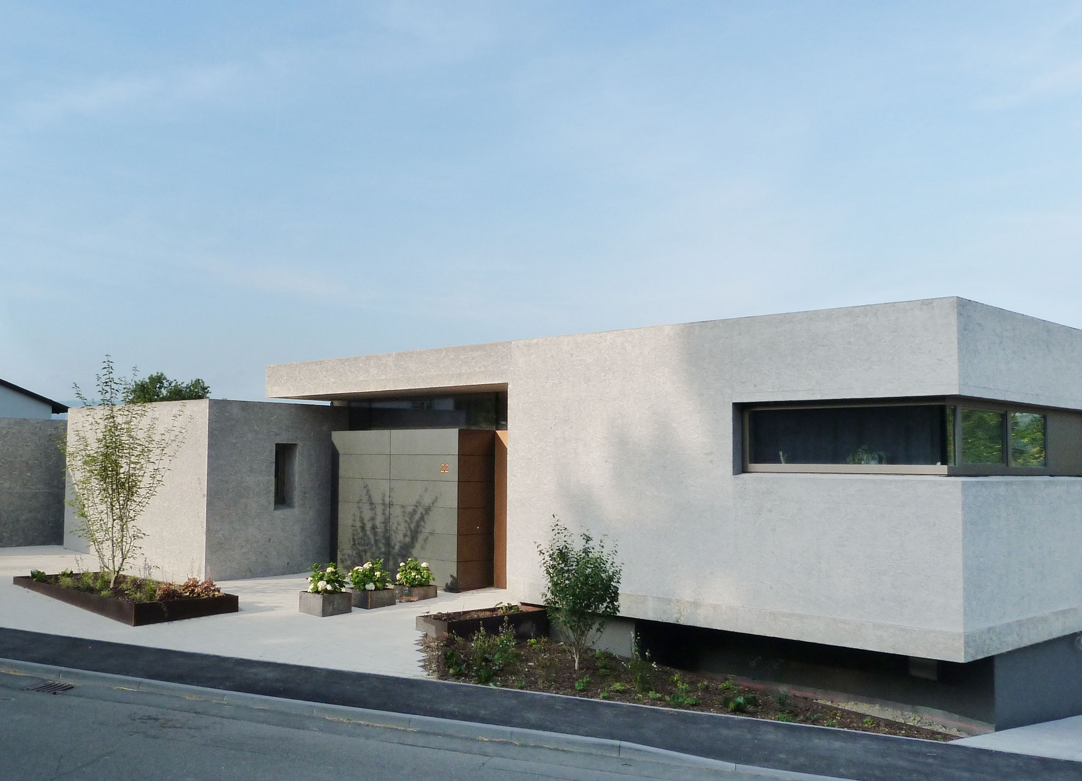Das Erdgeschoss des im September 2013 fertiggestellten Wohnhauses ist in drei Bereiche gegliedert und umfasst den Lebensbereich mit Küche und Essen sowie den Elternbereich im Norden, den Kinderbereich im Süden und den dazwischen liegenden Wohnraum. Die Außenräume bestehen aus vier Zonen, dem bewusst reduzierten Gebäudeeingang, dem von Gebäude und Garage eingerahmten Gartenbereich, dem Spielgarten im unteren Teil des Grundstücks und der Terrasse mit Atriumcharakter. Die durchgängige Aufteilung definiert die Wohn- und Lebensbereiche im gesamten Anwesen und schafft in ihrer Anordnung eine genau auf die Familie zugeschnittene Raumsituation.