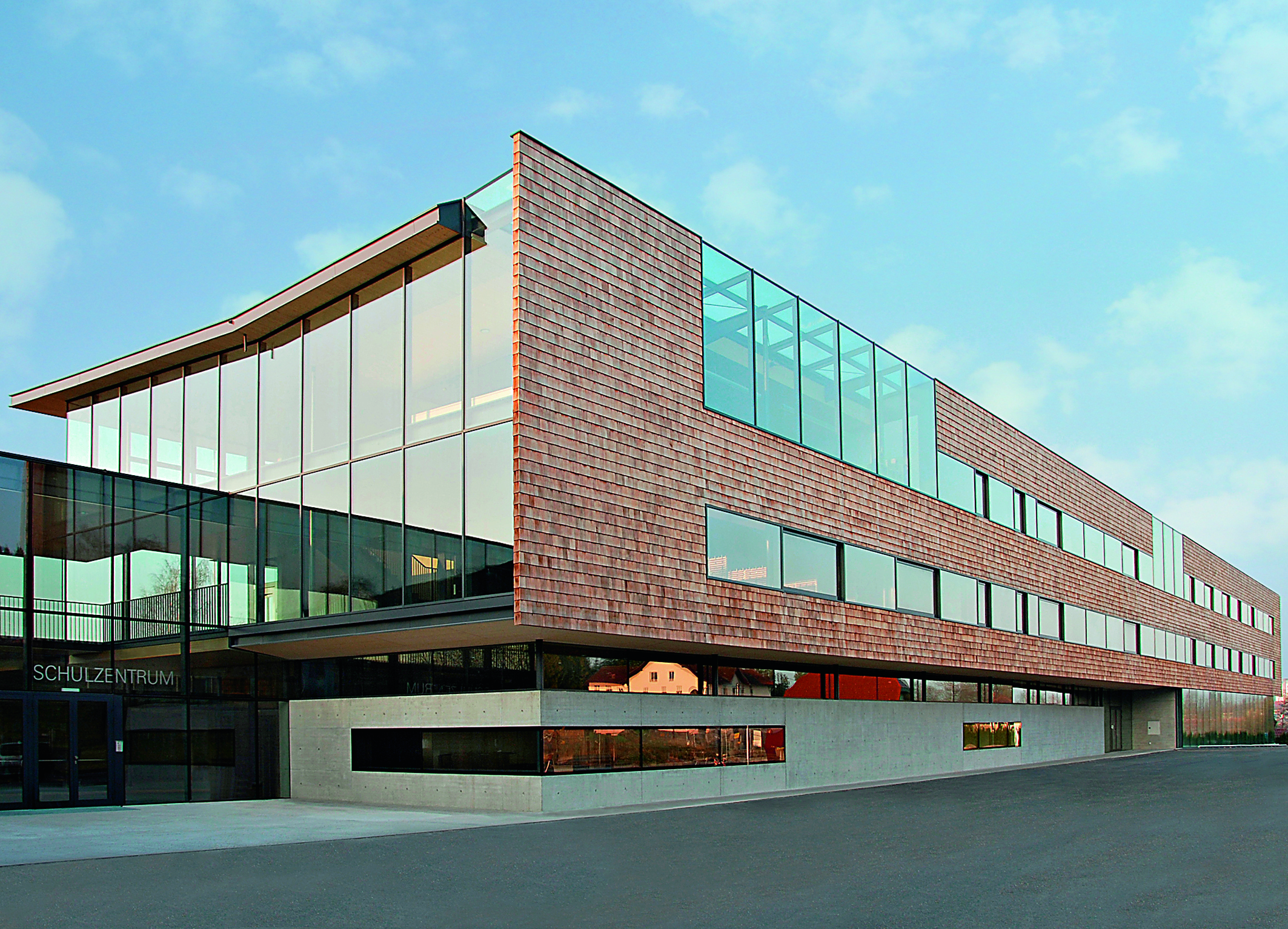 Im österreichischen Taufkirchen an der Pram steht seit Kurzem ein ganz besonderes Objekt: das neue Schulzentrum, das nach knapp zweijähriger Bauzeit im Juli 2009 feierlich eröffnet wurde. Der Bau mit seiner markanten Optik aus hellem Holz, Stahl und Glas war als Siegerobjekt aus einem EU-weit ausgeschriebenen Architektenwettbewerb hervorgegangen. Entworfen hat ihn Feichtinger Architectes mit Sitz in Wien und Paris, die mit dem prägnanten Baukörper eine Schule mit ganz besonderer Ausstrahlung realisierten. Das Gebäude mit seinem Sockel aus Sichtbeton, den zwei holzschindelverkleideten Obergeschossen und der angeschlossenen gläsernen Halle beinhaltet eine Volks- und Musikschule, daneben einen Kindergarten und eine Turnhalle. Alle Teilbereiche sind dabei klar räumlich und funktionell voneinander getrennt, gleichzeitig fügt sich das ganze Gebäude mit seiner klaren und lichten Atmosphäre ideal in den bestehenden Naturraum am Ufer der Pram ein. Dafür sorgen die breiten, vorgelagerten Balkonzonen auf der Rückseite des Gebäudes und die anschließende Grünfläche mit Baumbestand, während die geschlossen wirkende Gebäudefront die klare Abgrenzung zur Straße herstellt. Für die Errichtung des Gebäudes war die Weisshaidinger Ingenieur-Holzbau GmbH in Taufkirchen an der Pram als Generalunternehmer zuständig.
