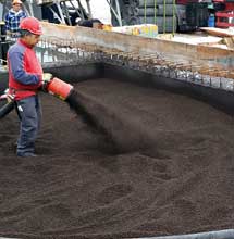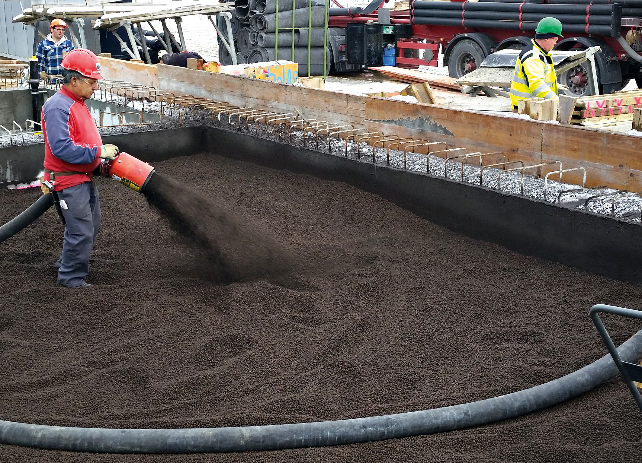 Beim Bau der Scherenrampen musste der darunterliegende Hohlraum innerhalb der einzelnen Rampensegmente bis auf ein Niveau verfüllt werden, auf dem sich dann die jeweiligen, rund 25 Zentimeter starken Betonbodenplatten als eigentliche Rampenbasis realisieren ließen. Es galt dabei, einen leistungsfähigen Baustoff zu finden, der einerseits ein nur geringes Gewicht aufweist, andererseits sich aber auch besonders schnell und einfach einbringen lassen sollte – und zwar ohne eigene Schalung innerhalb der Betonwände. "Die Wahl fiel letztlich auf rund 700 Kubikmeter Liapor Ground", erklärt Edwin Kramis, zuständiger Bauführer der ausführenden Estermann AG in Geuensee. "Das Blähtongranulat ist besonders leicht und ließ sich per Einblastechnik schnell und einfach direkt vom Silo-Lkw über Schlauchleitungen an seinen Einsatzort verbringen." Dadurch waren auch keine Materiallager auf der Baustelle erforderlich, und auch der Baukran wurde nicht belegt. "Ein weiterer Vorteil lag darin, dass Liapor hochwärmedämmend wirkt. Damit konnte auf zusätzliche Dämmung unter der Bodenplatte verzichtet werden", so Edwin Kramis.
