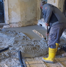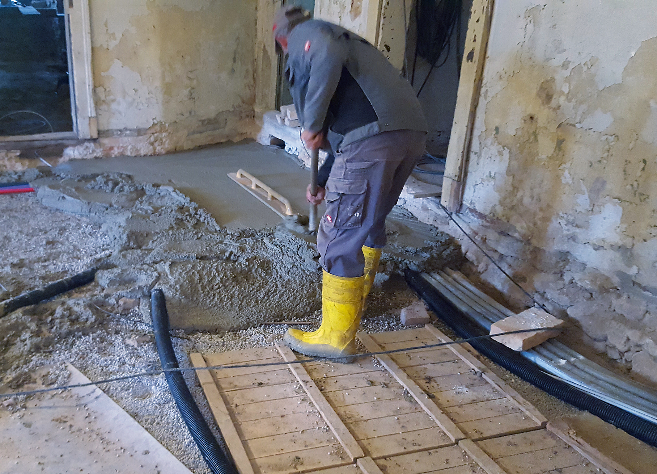 Im Erdgeschoss des Schlosses kamen insgesamt rund 90 Kubikmeter Liapor 4-8 zum Einsatz. Den Kalk für die gebundene Schüttung lieferte der Baustoffhandel der Familie Kuhn. Nach einigem Experimentieren war das passende Mischungsverhältnis gefunden, um die geforderte Trittfestigkeit sicherzustellen. Im Detail besteht der Fußboden von unten nach oben aus einer losen Liapor-Schüttung und einer bis zu zehn Zentimeter starken kalkgebundenen Liapor-Schüttung. Darauf folgen Eisen-Estrich-Matten, die Fußbodenheizungsschlingen und eine Schicht aus Estrichsand in Verbindung mit hydraulischem Kalk als Kalkestrich. Den Abschluss bildet der Bodenbelag in Form von Natursteinfliesen oder Terracotta-Platten. Nach diesem Schema wurde bis Anfang 2018 der gesamte Erdgeschossboden im Schloss neu aufgebaut.