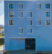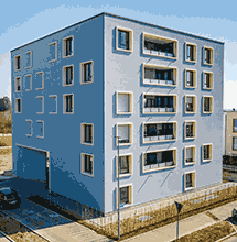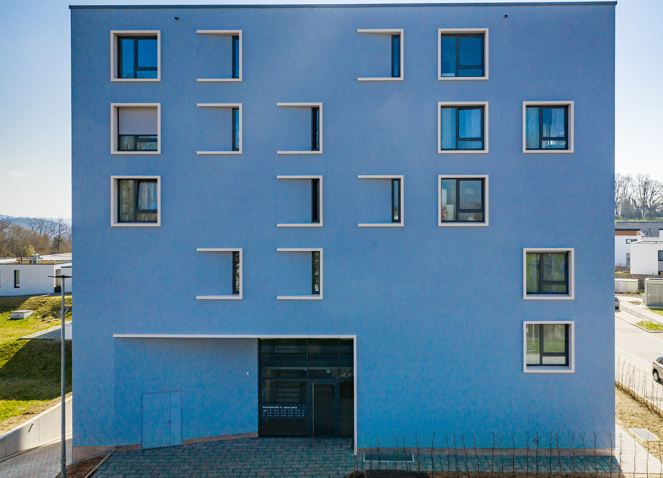 In der Hochvogelstraße 56 in Biberach steht seit Kurzem ein markantes, sechsstöckiges Wohnhaus, das auf einer Gesamtfläche von rund 1.500 Quadratmetern Platz für insgesamt 18 familienfreundliche Wohnungen bietet. Der hoch aufragende, in hellem Blau gestaltete Kubus ist bewusster Teil der umgebenden Neubebauung und dient als Entree zum gesamten Ensemble. Errichtet wurde er unter der Bauherrschaft der Baugenossenschaft Biberach eG, als Architekt fungierte die ZG Architekten GmbH in Ulm. Das Büro hatte den vorangegangenen Wettbewerb gewonnen und das unabhängige Preisgericht mit Vertretern der Bauherrschaft, der Stadt Biberach und des örtlichen Gestaltungsbeirats überzeugt: „Entscheidend war, dass das Gebäude von den Nutzungsbedingungen wie Wohnfläche, Wohnungs- und Geschossanzahl her gepasst hat, für uns als Bauherr aber auch im wirtschaftlich verfügbaren Rahmen lag“, berichtet Patrick Detzel, geschäftsführender Vorstand der Baugenossenschaft Biberach eG. Zudem passte das Gebäude wie gewünscht gut zum städtebaulichen Kontext, und nicht zuletzt gefiel auch die Idee der Fenster mit farblich abgesetzter Haptik, die die Fassade akzentuieren.