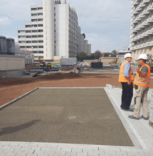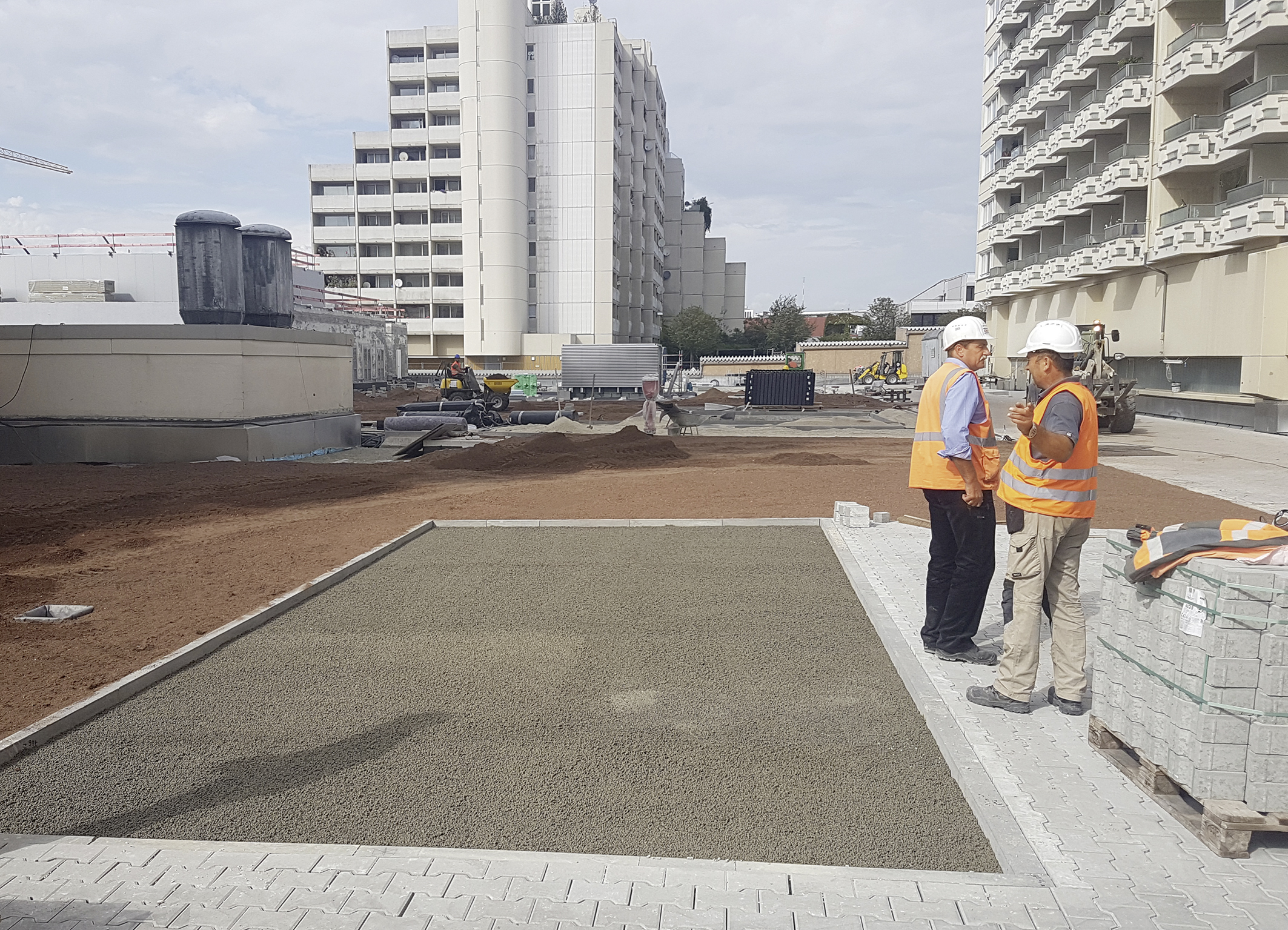 „Die zementgebundene Liapor-Blähtonschüttung erfüllt mit einem Gewicht von unter 500 kg/m³ und einer Druckfestigkeit von 1,5 N/mm² alle statischen Anforderungen“, erklärt Alexander Habeker, Leiter des Betonlabors bei der Ganser Beton GmbH & Co. KG. „Gleichzeitig zeichnet sich die Schüttung durch einfaches Handling und unkomplizierten Eintrag aus.“ Der Eintrag erfolgte mittels Schüttkübeln, die die Schüttung vom Fahrmischer auf das Dach beförderten. Dort wurde das Material mittels Raupenbagger verteilt und anschließend manuell abgezogen. Die durchschnittliche Schichtstärke betrug rund 20 Zentimeter und insgesamt wurde eine Fläche von etwa 4.000 Quadratmetern verfüllt. Die kurze Austrocknungszeit der zementgebundenen Liapor-Schüttung, bei der die Komponenten Liapor-Blähton, Zement und Wasser genau aufeinander abgestimmt sind, sorgte dabei für eine sehr schnelle Nutzbarkeit. So waren alle Flächen bereits am nächsten Tag nach Eintrag begehbar. Positiver Nebeneffekt: Die rein mineralische Schüttung schützt auch wirkungsvoll vor Kälte, Frost und Feuchtigkeit und wirkt zudem schalldämmend. Den oberen Abschluss der Schüttung bilden zehn Zentimeter starke Pflastersteine.