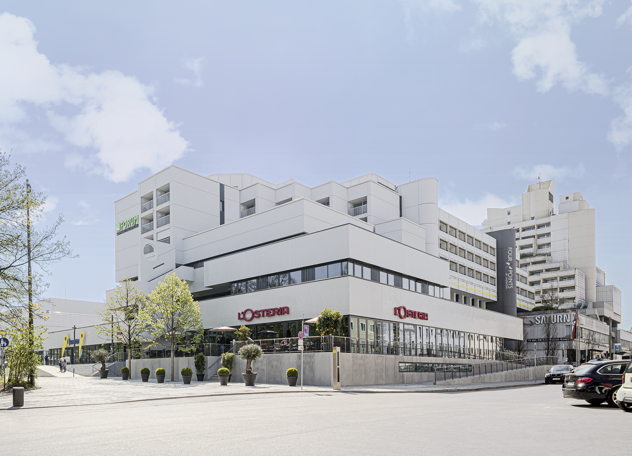 In den Siebzigerjahren von Architekt Ernst Maria Lang als Nahversorgungszentrum entworfen, zählt der Gebäudekomplex an der Schwanthalerhöhe zu den prägendsten Elementen des Münchner Westends. Insbesondere die drei Wohntürme in Plattenbauweise über dem Einkaufszentrum bestimmen weithin sichtbar die Silhouette des Viertels. Charakteristisch ist dabei die Sichtbetonoptik des gesamten Ensembles, aber auch dessen eher uneinheitliches Gesamterscheinungsbild mit einer Vielzahl architektonischer Einzelelemente sowie unübersichtlichen Zu- und Durchgängen in den unteren Etagen. Als 2015 die Filiale einer großen Möbelhauskette im Forum schloss, entschied man sich für eine langfristige Revitalisierung und Erneuerung des gesamten Komplexes. Den Auftakt bildeten die Sanierung und Erweiterung der nördlichen Hälfte des Areals mit rund 25.000 Quadratmetern Mietfläche. Unter der Bauherrschaft der Hamburger HBB Hanseatische Betreuungs- und Beteiligungsges. mbH fungierte RKW Architektur aus Düsseldorf als Entwurfsverfasser und ausführendes Architekturbüro, die Bauausführung übernahm die Ed. Züblin AG in München. Der Fokus der Maßnahmen lag auf der Restrukturierung der Verkaufsflächen und der Sanierung der Fassaden in den oberen Geschossen. Hier wurden die Faserzementplatten des Bestands beseitigt und zum Großteil durch ein helles, reflektierendes Glasmosaik ersetzt.
