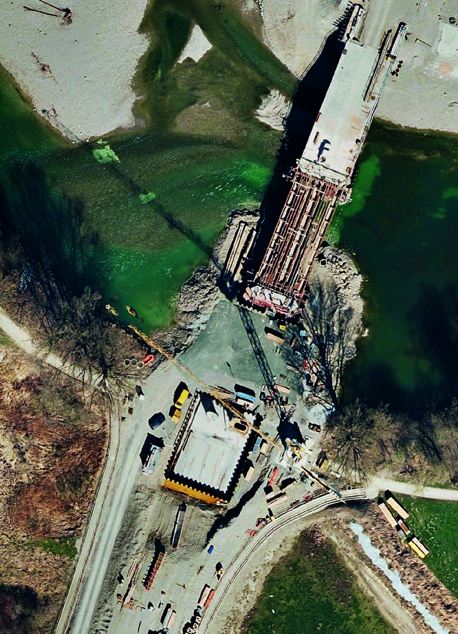 Mitte 2012 fiel der Startschuss für den Bau der neuen Nordspange in Kempten, die als künftige Ost-West-Verbindung die Gewerbegebiete Stiftsbleiche und Ursulasried miteinander verbindet. Zentrales Element des rund 13,1 Millionen Euro teuren Infrastrukturprojekts ist die neue Brücke über die Iller, die damit die vierte bauliche Überquerung des Flusses im Stadtgebiet darstellt. Vor dem Brückenbau wurde im Talraum der Iller ein rund vier Meter hoher Damm aus Erde und Kies für die Nordspange mit ihrer Fahrbahnbreite von 7,5 Metern aufgeschüttet. Anschließend begannen die Arbeiten für das eigentliche Viadukt. "Eine technische Herausforderung stellte die Brückengründung auf dem weichen Beckenton dar", erklärt Michael Kral vom Amt für Tiefbau und Verkehr in Kempten. "Die Umsetzung erfolgte als schwimmende Rammpfahlgründung bis zu einer Tiefe von 30 Metern. Das Brückenbauwerk selbst wurde als Dreifeldbrücke mit einer Spannweite von 102 Metern sowie einseitigem Geh- und Radweg ausgeführt."