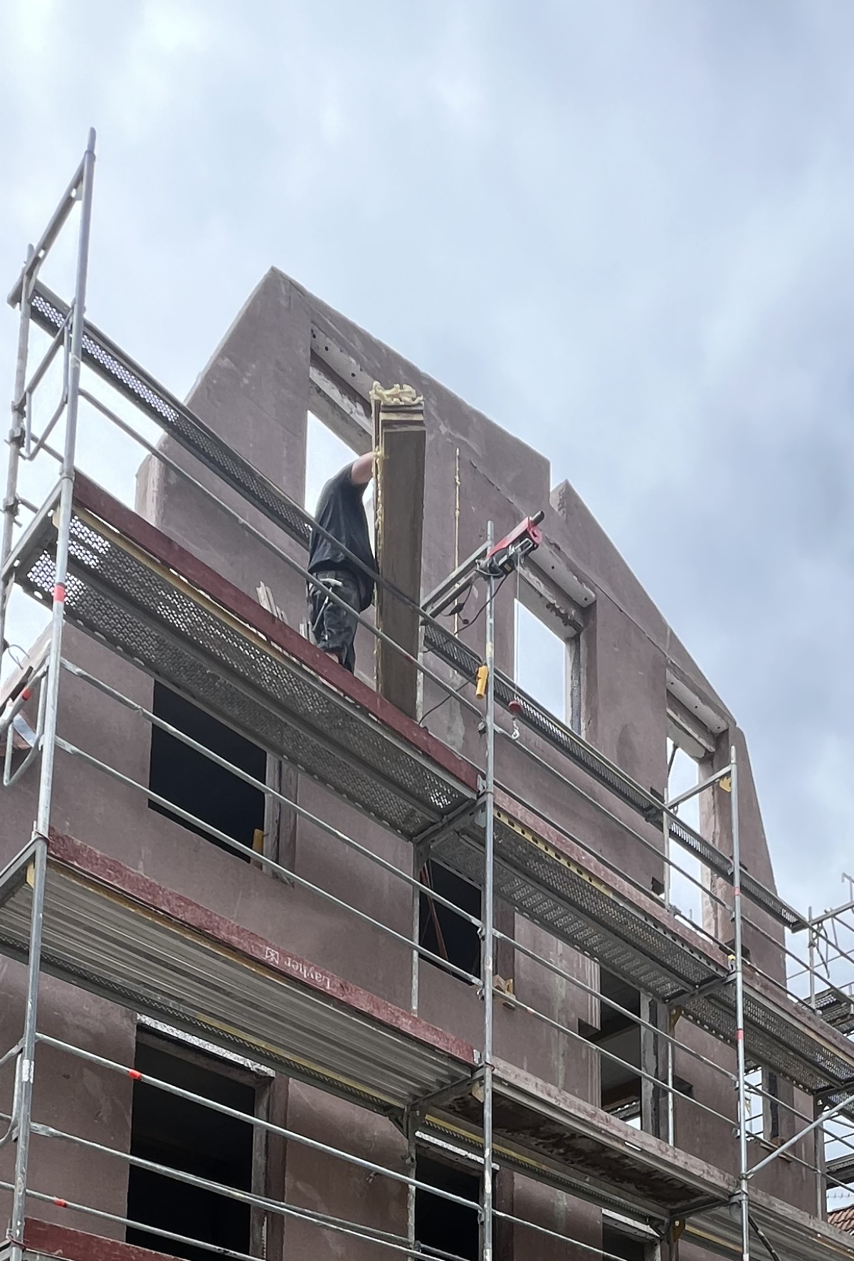 Vor Ort ließ sich die gesamte Gebäudehülle über dem Erdgeschoss innerhalb von nur zwei Monaten errichten, wobei etappenweise jedes Geschoss binnen einer Woche erstellt wurde. Dieses Tempo wurde auch durch die hohe Passgenauigkeit und den hohen Vorfertigungsgrad der Elemente ermöglicht, der zusätzliche Arbeitsschritte vor Ort auf ein Minimum reduzierte. So waren die bis zu zwei mal drei Meter großen Elemente bereits innenseitig fertig gespachtelt und mussten nur noch von außen verputzt werden. Außerdem waren in den Liapor-Wandelementen bereits alle Öffnungen für Türen und Fenster sowie die Rohre und Schlitze für die Haustechnik und die Elektroinstallation enthalten.