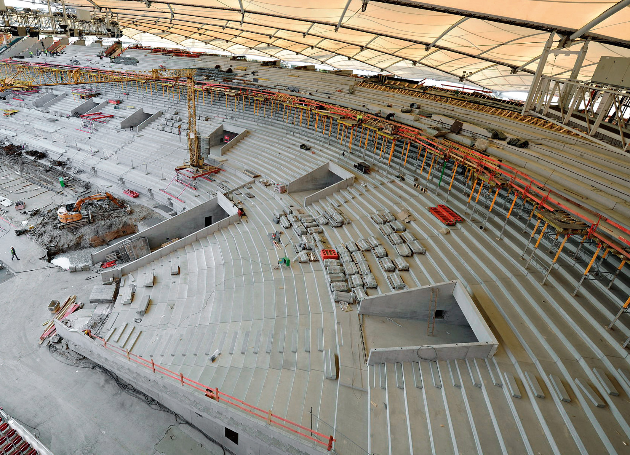 Rund 1.500 individuell angefertigte Laufstufen aus Liapor-Leichtbeton wurden nach einem genauen Schema auf den neuen Tribünenkörper montiert.